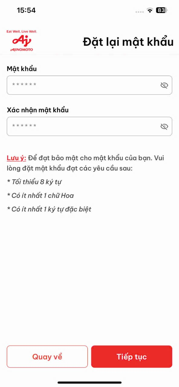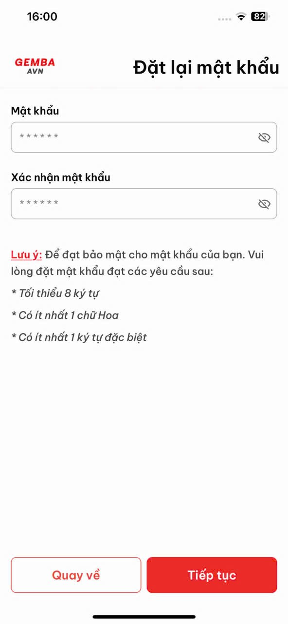 - Người dùng chọn Đổi mật khẩu > Điền mật khẩu mới và nhập lại mật khẩu > Nhấn Tiếp tục để hoàn tất việc thay đổi mật khẩu