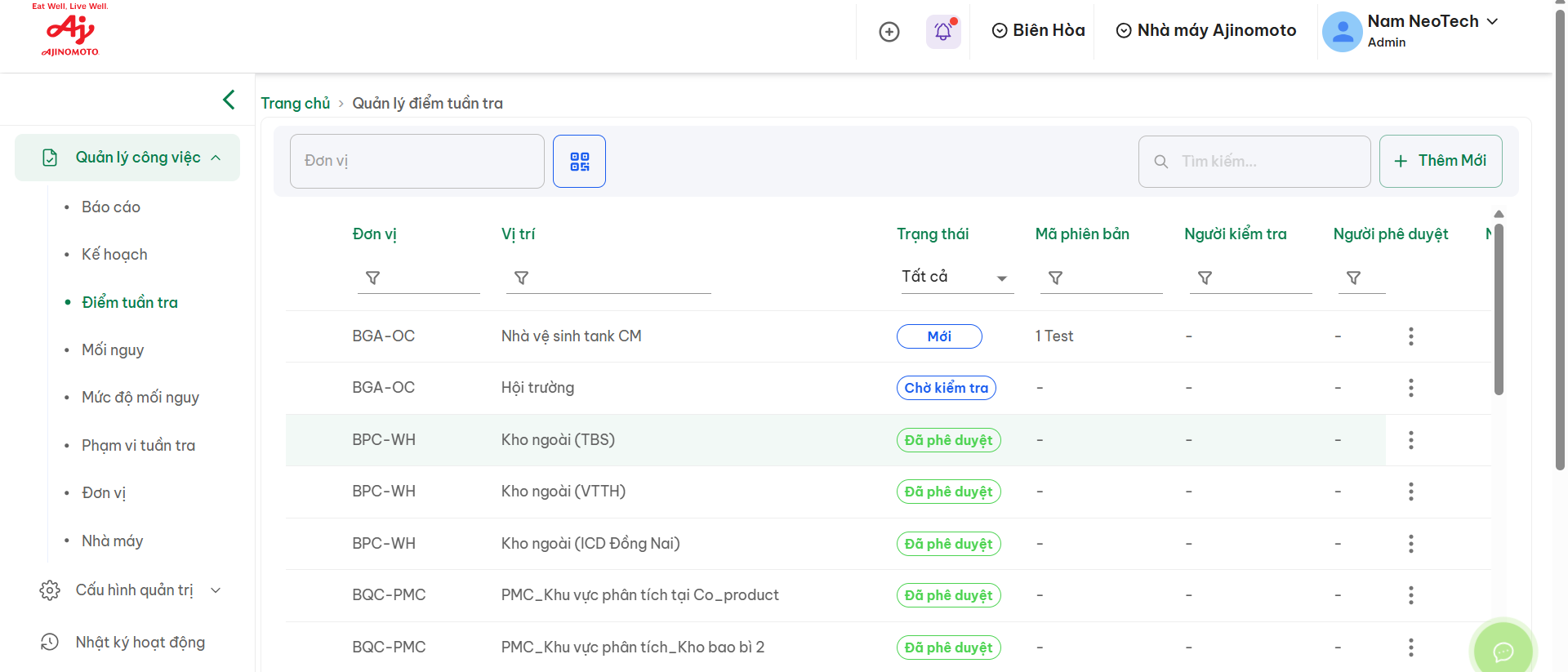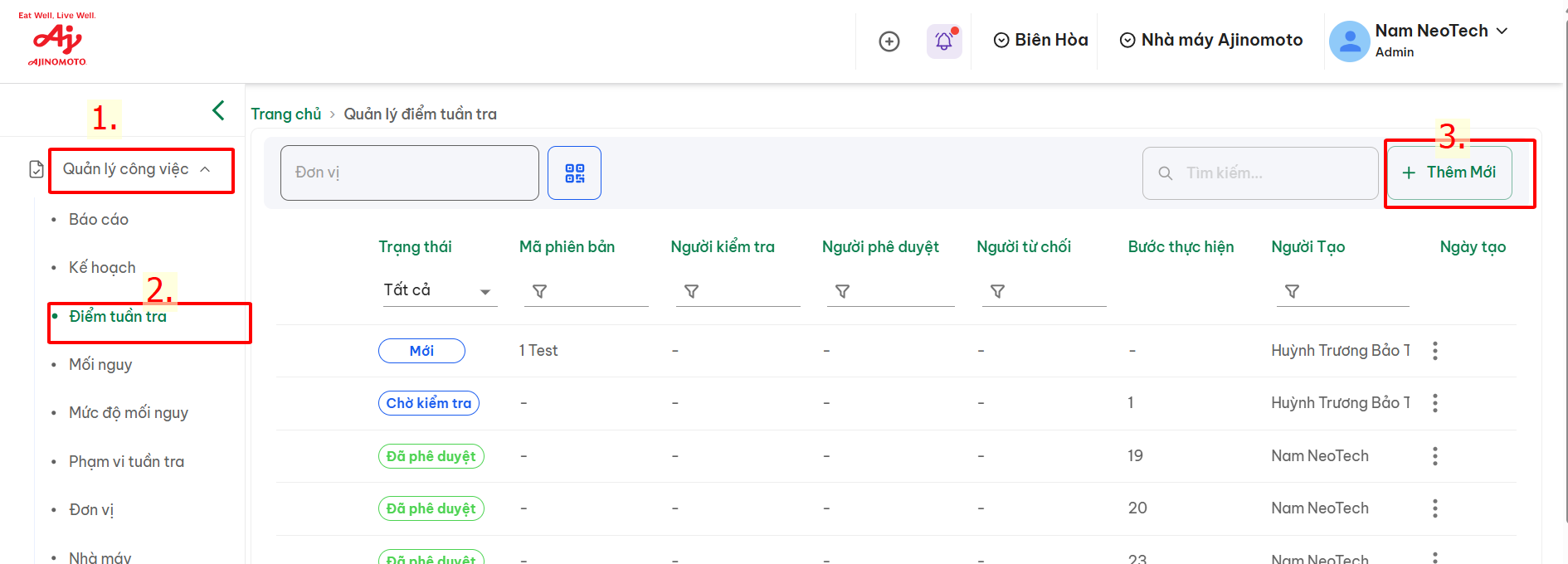 Bước 1. Quản lý công việc(1) > Điểm tuần tra(2) > Chọn "Thêm mới" (3)