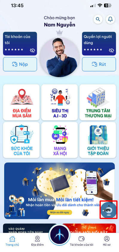 Màn hình hiển thị trang chủ: Sau khi đăng nhập có thể thao tác các tính năng trong hệ thống, đồng thời ứng dụng có tích hợp chat-box AI cho người dùng nếu có muốn đặt câu hỏi gì thì nhấn vào biểu tượng robot đó
