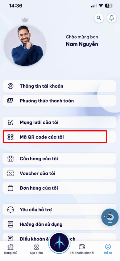 Bấm tab " Tài khoản " > Bấm vào mã " QRCode của tôi"