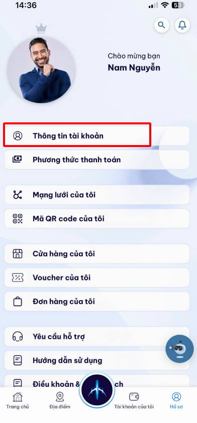 Bước 1: Bấm Tab tài khoản > Bấm " Thông tin tài khoản"