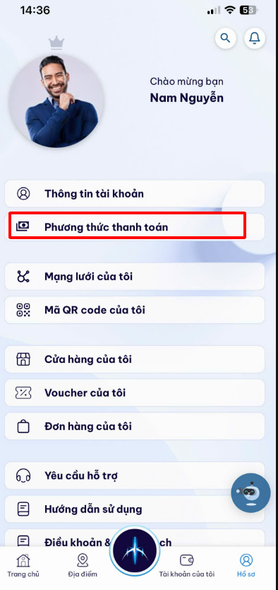 Bước 1: Chọn Tab tài khoản > Chọn Phương thức thanh toán > Hiển thị màn hình phương thức thanh toán