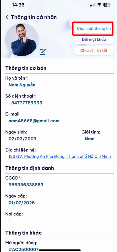 Bước 2: Bấm cập nhật > Cập nhật thông tin > bấm lưu