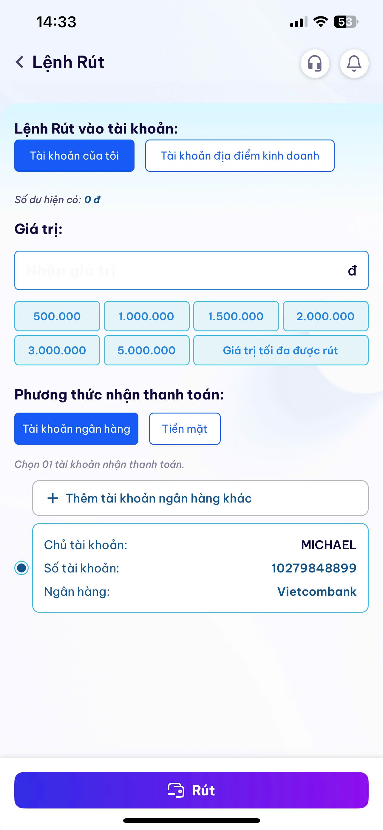 Trường hợp 2: Chọn ví rút tiền , Chọn số tiền rút > Rút tiền bằng "Tài khoản ngân hàng" > Chọn tài khoản ngân hàng nhận tiền > Bấm " Rút"