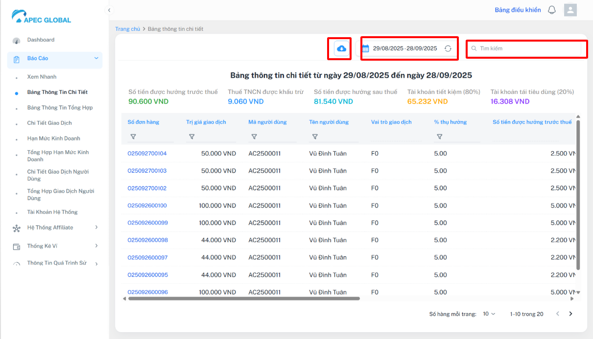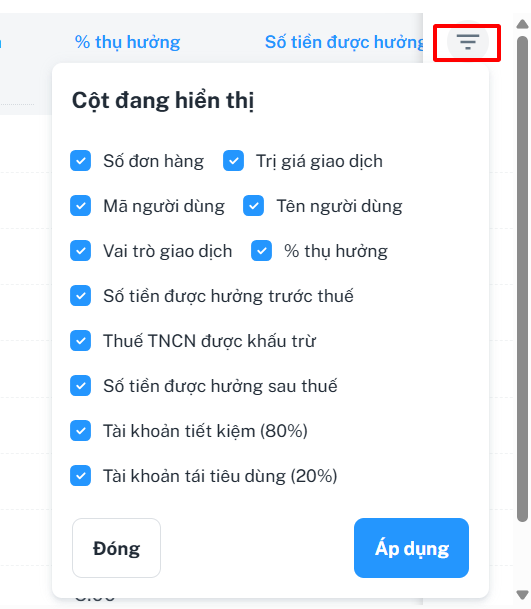 Bao gồm : Số đơn hàng | Trị giá giao dịch | Mã người dùng | Tên người dùng| Vai trò giao dịch| % thụ hưởng| Số tiền được hưởng trước thuế| Thuế TNCN được khấu trừ | Số tiền được hưởng sau thuế | Tài khoản tiết kiệm (80%) | Tài khoản tái tiêu dùng (20%)