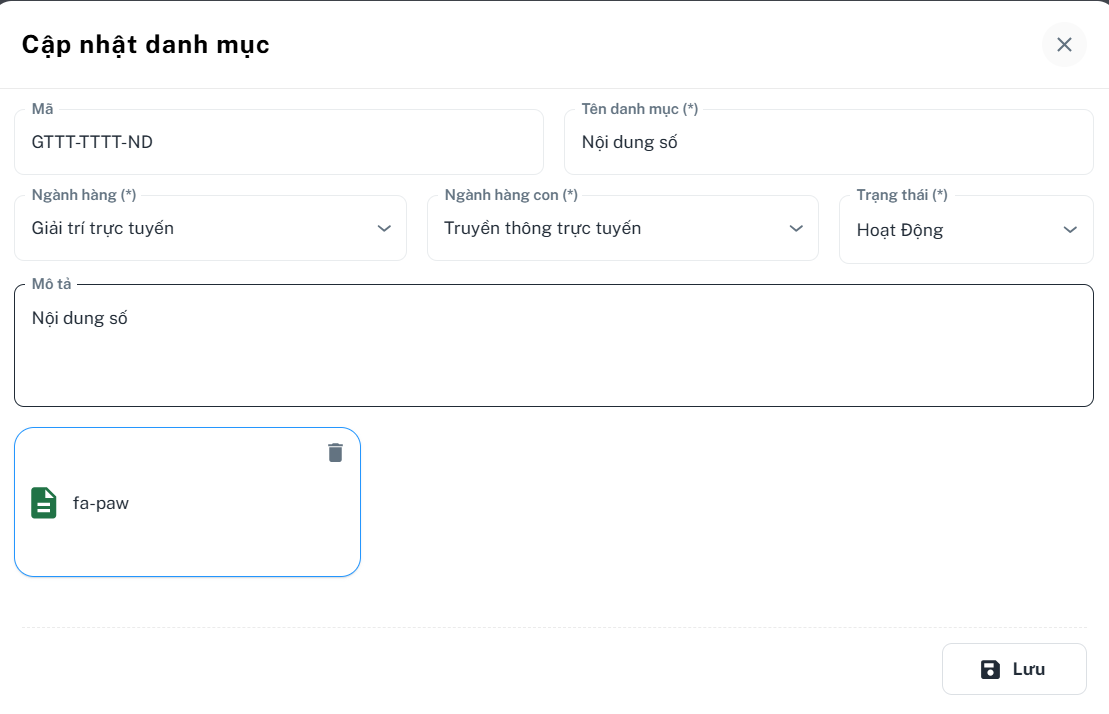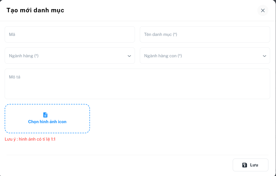 Mã | Tên danh mục | Ngành hàng| Ngành hàng con | Mô tả | Trạng thái
