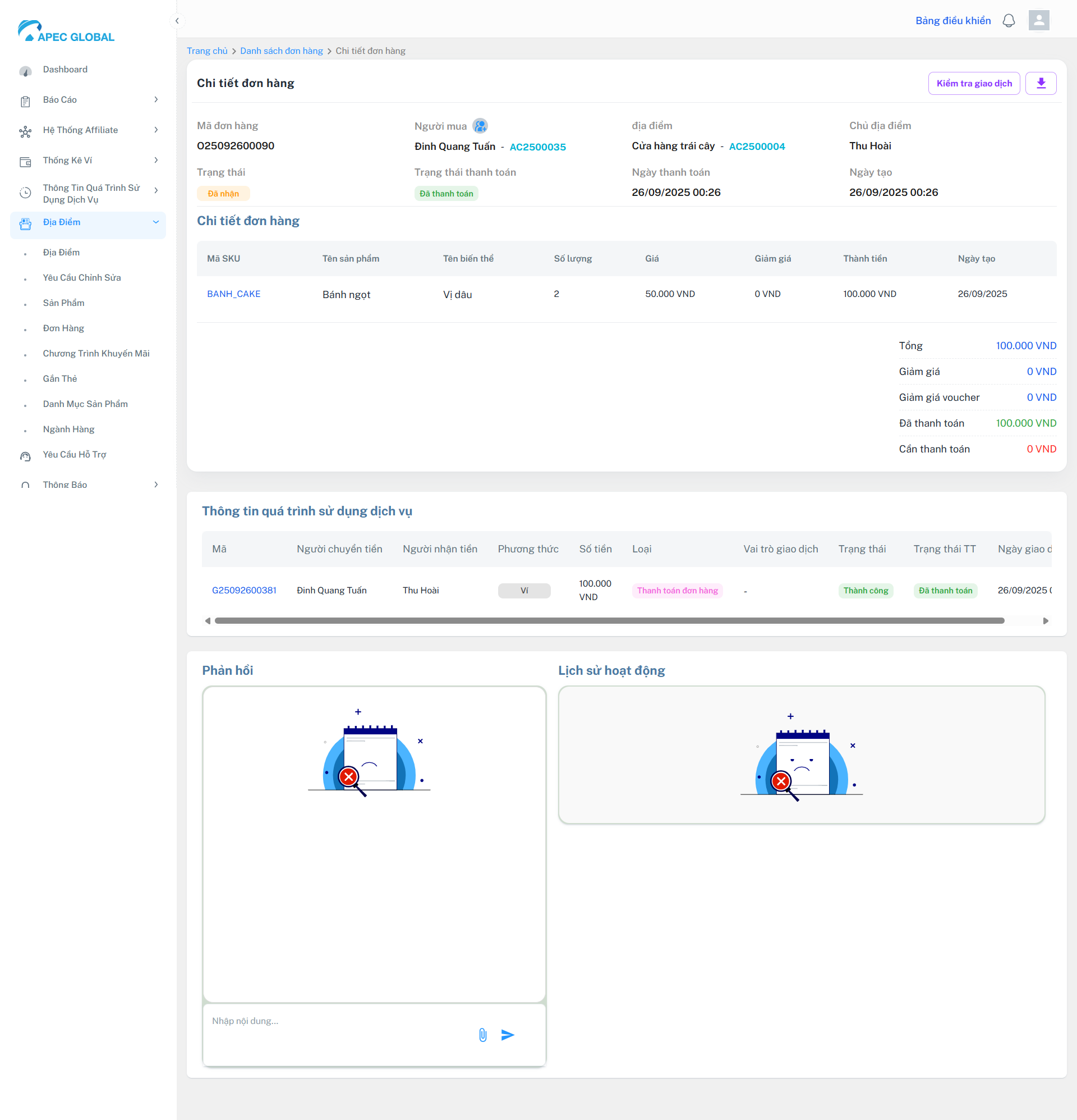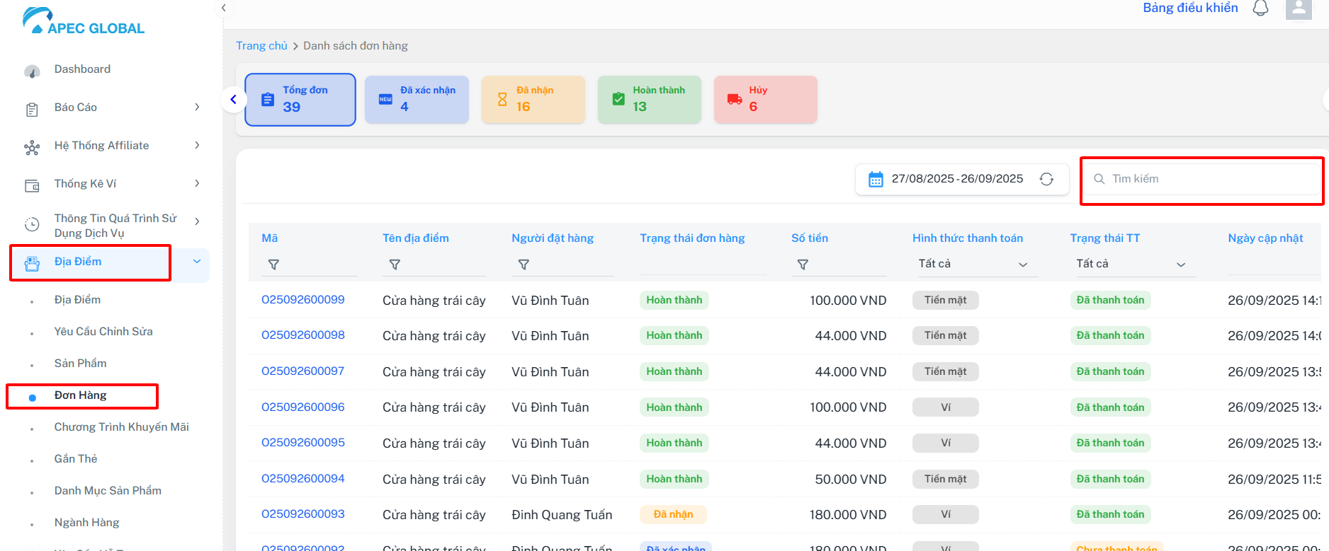 Mã | Tên địa điểm | Người đặt hàng | Trạng thái đơn hàng | Số tiền | Hình thức thanh toán | Trạng thái | Ngày cập nhật