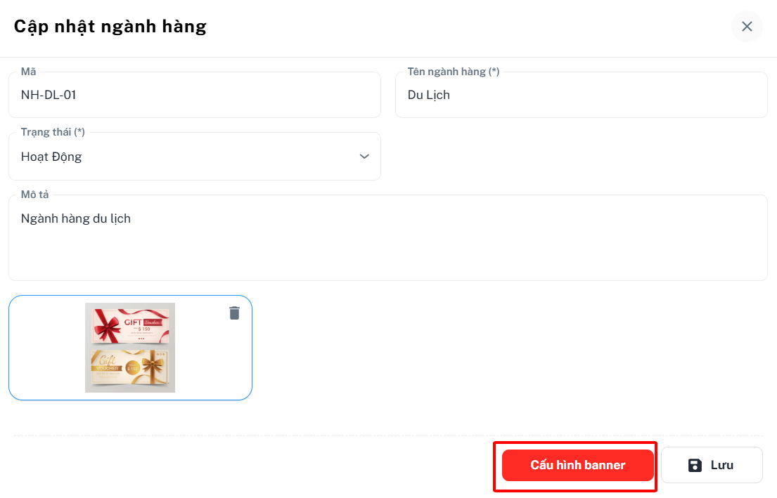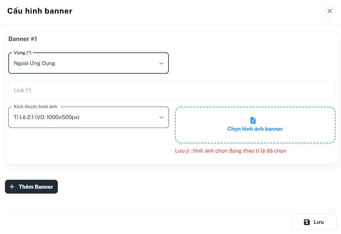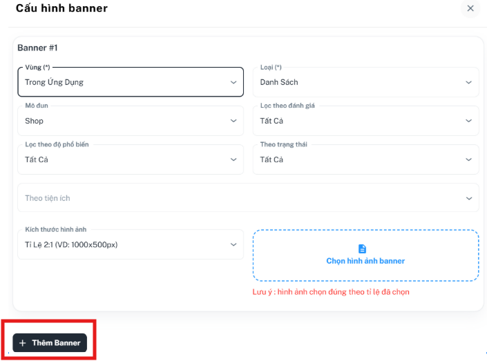 Khi cập nhật ở ngành hàng cha : Người dùng có thể thêm cấu hình banner cho ngành hàng. *TH1: Nếu người dùng chọn vùng là trong ứng dụng thì lần lượt chọn các nội dung ở các ô kế tiếp theo nhu cầu từ phần chọn Loại ( hiển thị theo Danh sách | Chi tiết ), Mođun ( Shop hay Product ), Đánh giá( Tất cả hoặc chọn theo sao : vd 3 sao,.. ), Độ phổ biến ( Hot nhất, Mới nhất), Trạng thái ( Mở cửa 24/7, Đang mở cửa ), Tỷ lệ khung hình.