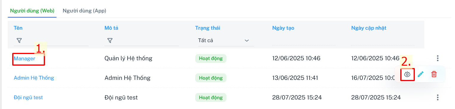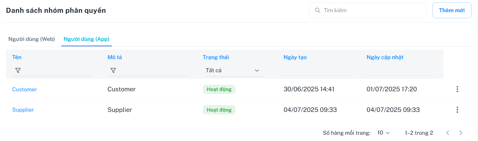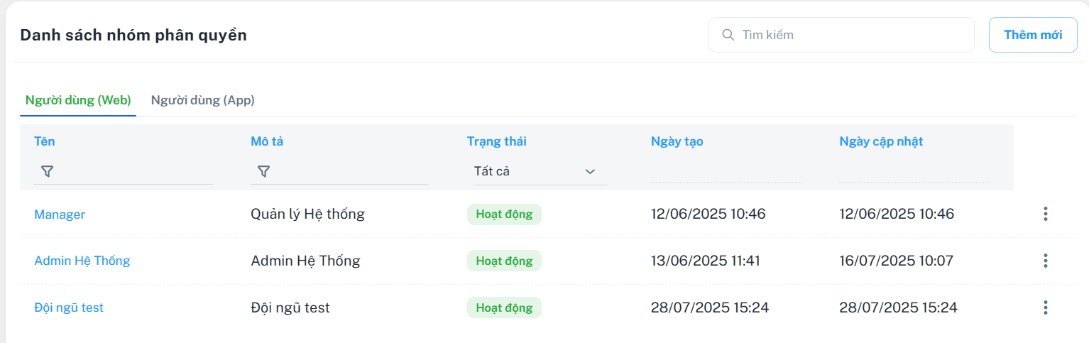 Gồm các nội dung : Tên quyền | Mô tả | Trạng thái | Ngày tạo | Ngày cập nhật