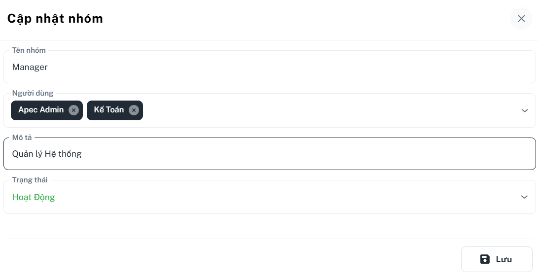 ** Người dùng được gán ở mục này sẽ tương ứng quyền hạn của mình khi vào trình duyệt web ví dụ như trên Apec Admin và Kế toán sẽ có role là Manager ( Manager : tên do quản trị trong APEC đặt )
