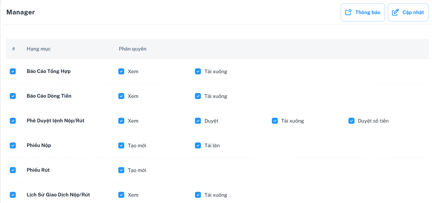 **Cập nhật các chức năng thao tác ứng với quyền hạn của người quản trị