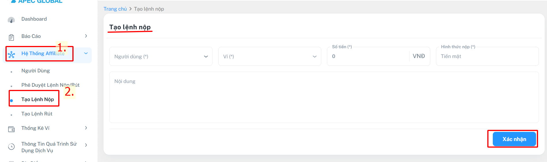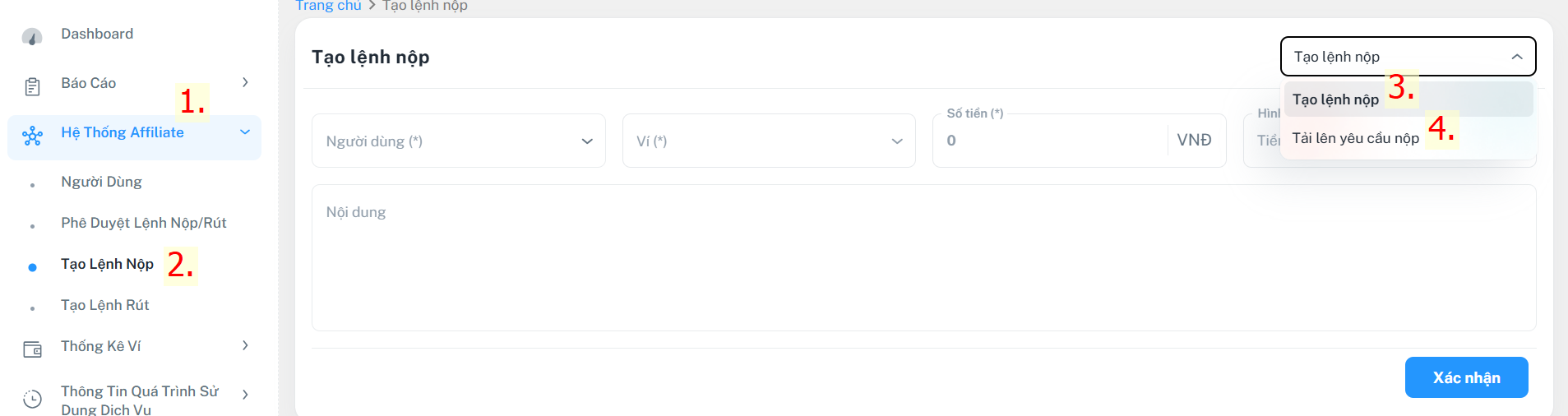 Thao tác: Hệ thống Affiliate(1) > Phiếu nạp(2) > Điền thông tin > Xác nhận