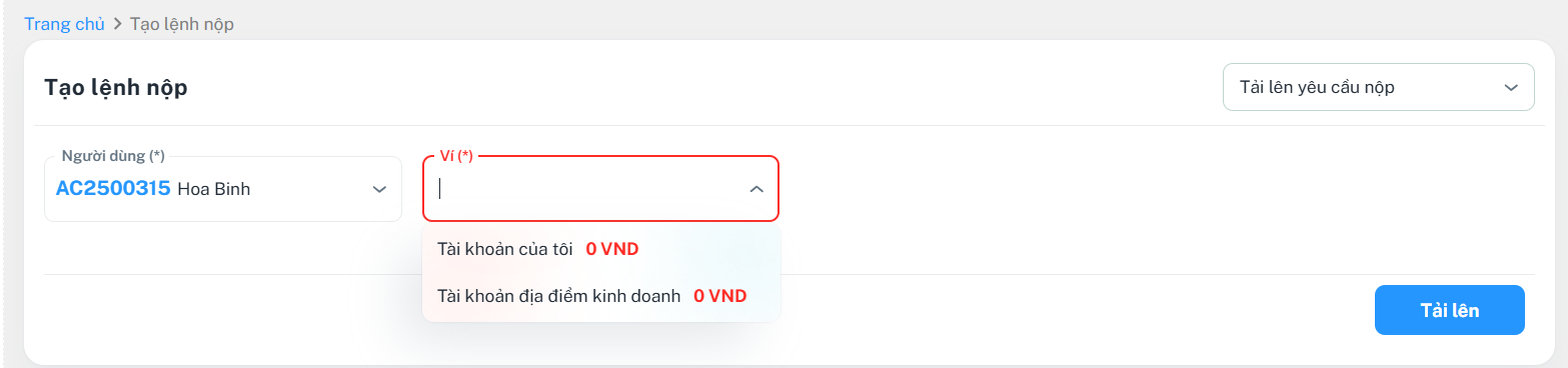 B2: Chọn tên người dùng > Ví muốn Import phiếu nộp > Tải lên