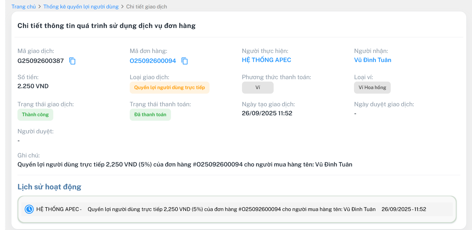 Mã giao dịch | Số đơn hàng | Loại giao dịch | Vai trò giao dịch | Phương thức thanh toán | Tên người dùng | % thụ hưởng | Số tiền được hưởng trước thuế | Thuế TNCN được khấu trừ | Số tiền được hưởng sau thuế | Ngày giao dịch