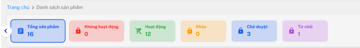 - Lọc sản phẩm theo trạng thái: Hoạt động | Không hoạt động | Khóa | Chờ duyệt | Từ chối