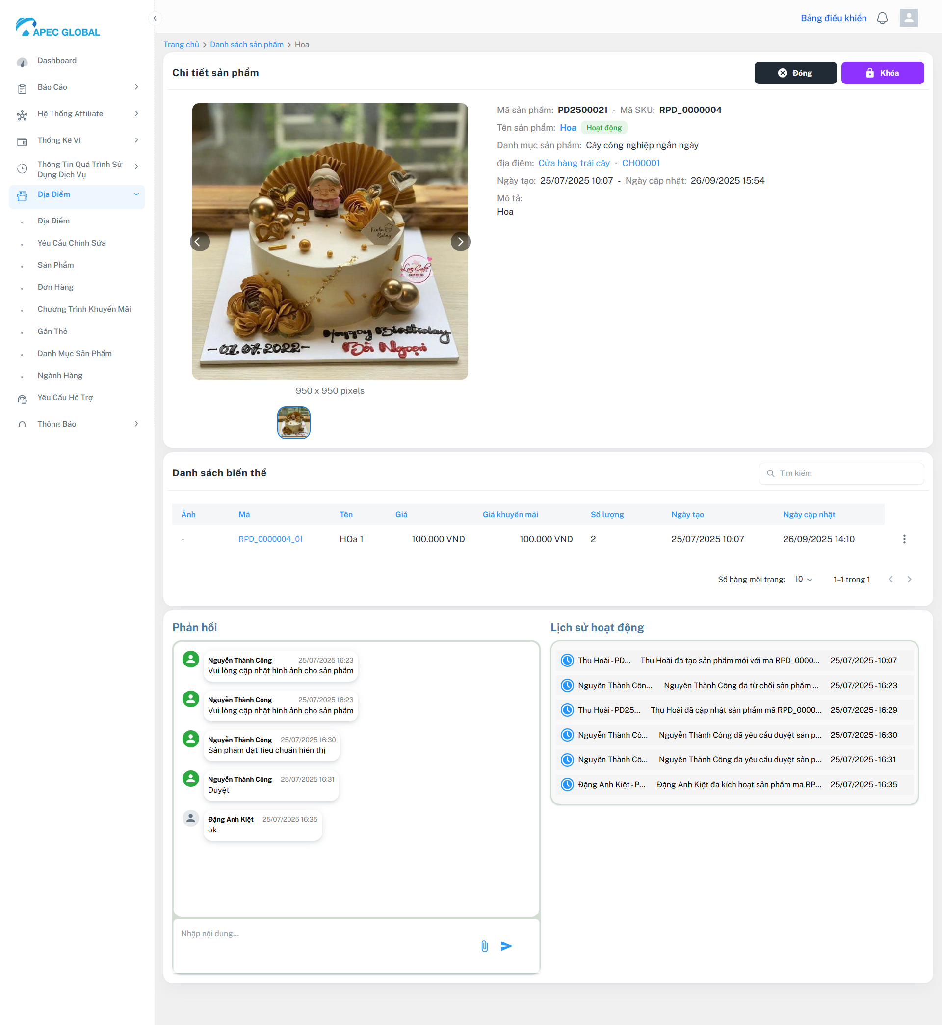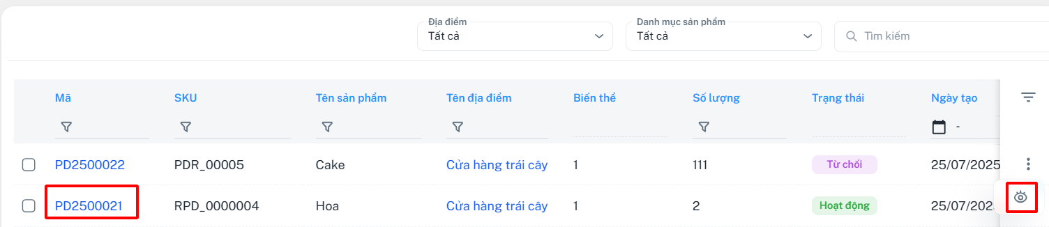 Thao tác: Tại màn hình danh sách sản phẩm > Bấm vào mã sản phẩm hoặc bấm vào tác vụ