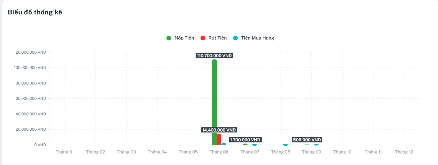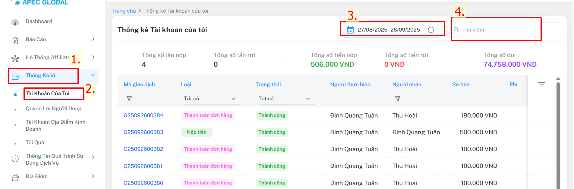 Thao tác: Thống kê ví(1) > Tài khoản của tôi (2)