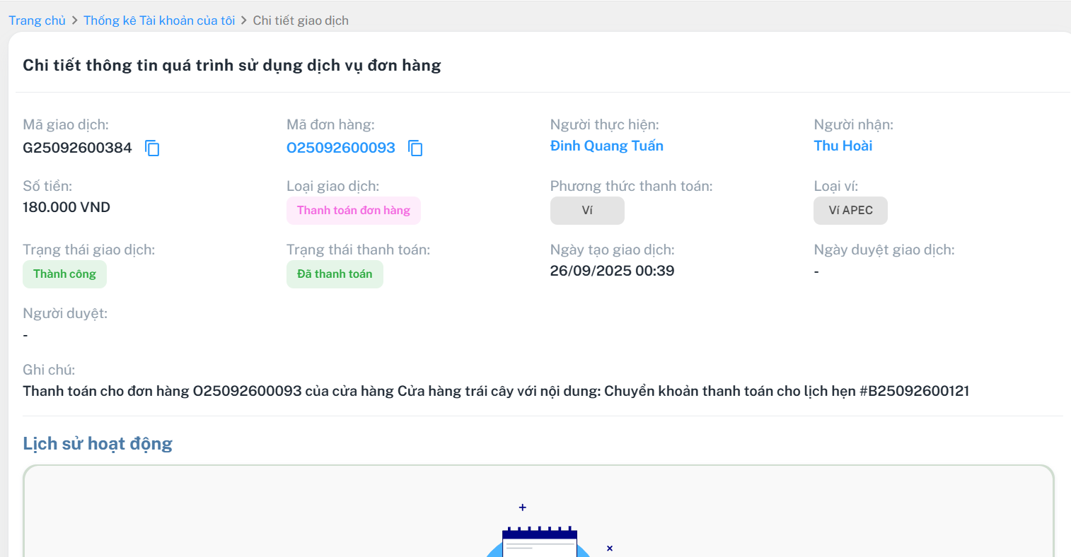 Mã giao dịch | Loại | Trạng thái | Ghi chú | Người thực hiện | Người nhận | Số tiền | Phí | Ngày giao dịch