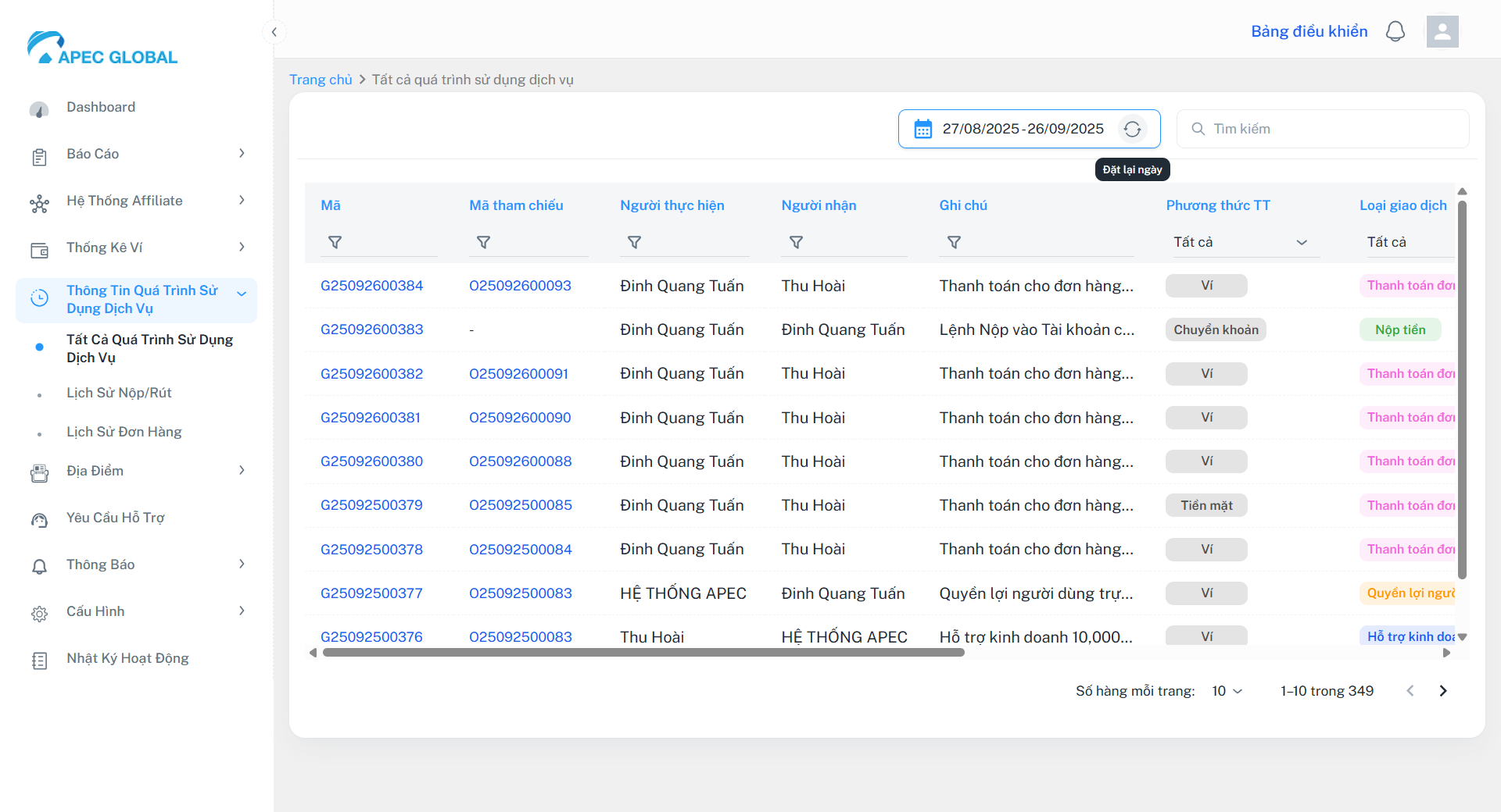 Tại trang này: Cho phép lọc giao dịch theo thời gian và tìm kiếm giao dịch theo từ khóa