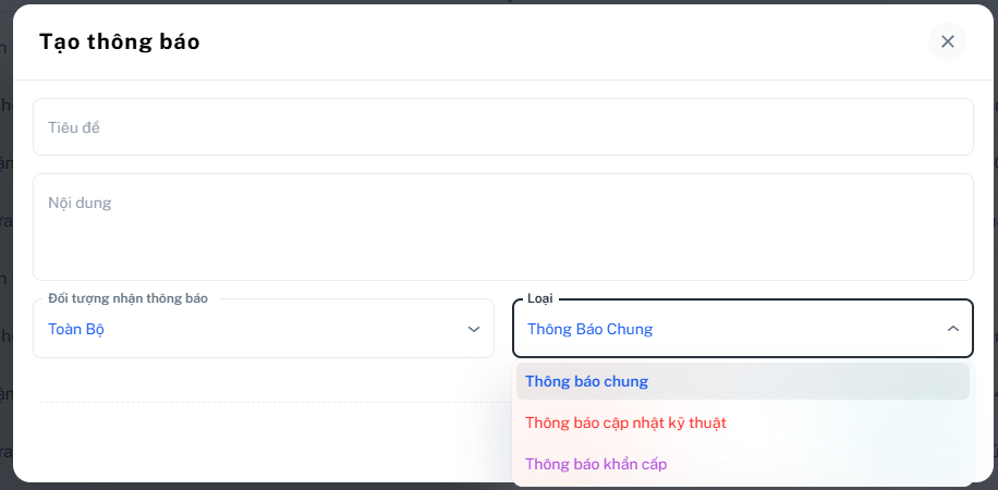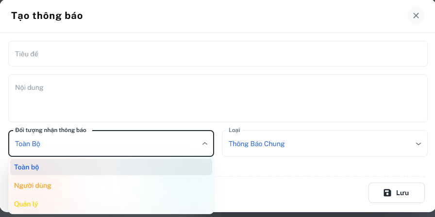 Lần lượt điền các thông tin vào và chọn loại và đối tượng cần được nhận thông báo cho phù hợp > Nhấn Lưu