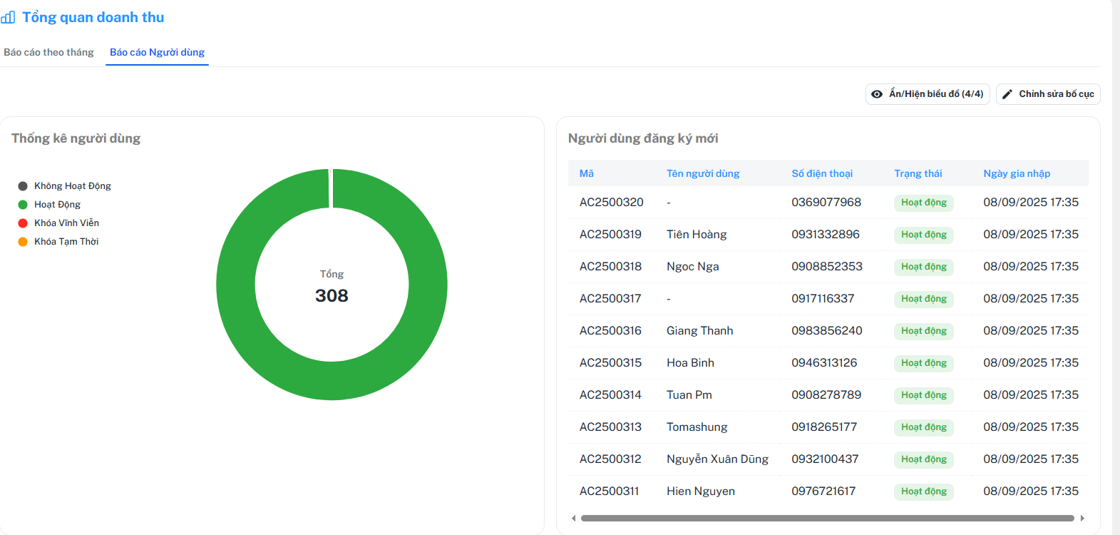 - Báo cáo theo người dùng đăng nhập theo tháng :