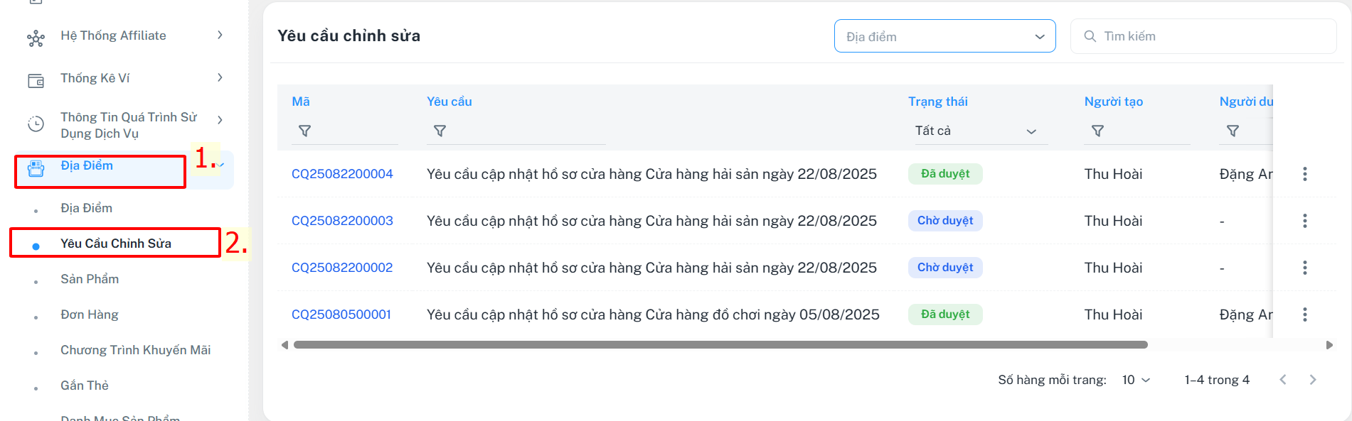 Hiển thị các yêu cầu chỉnh sửa cửa hàng mà Nhà Cung Cấp gửi lên cho Ban quản trị