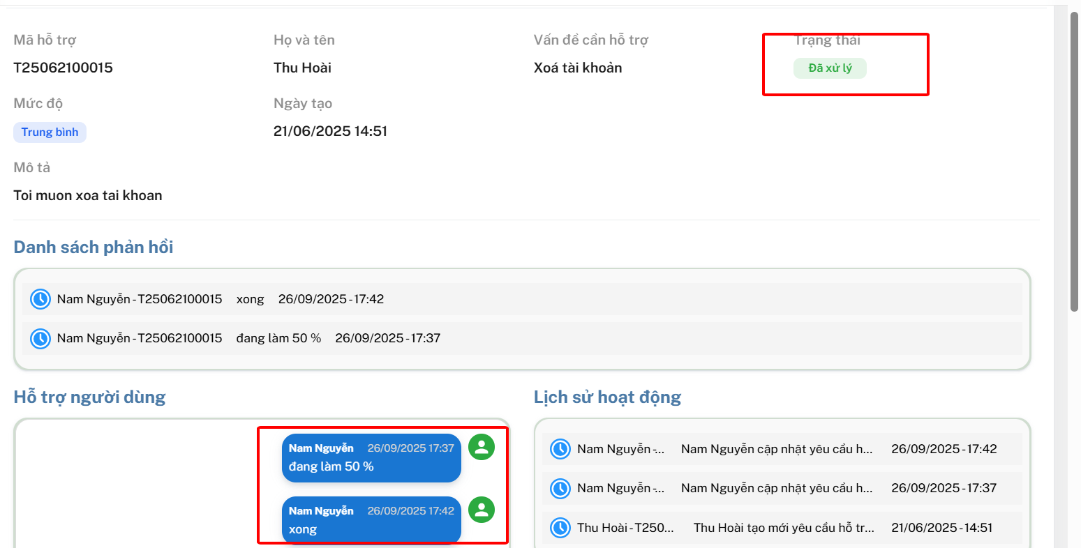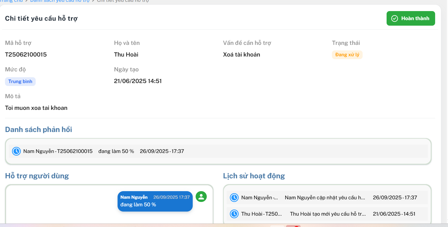 **Nhấn Xác nhận xong thì trạng thái sẽ qua " Đang xử lý " > Nếu nhấn Hoàn thành thì điền nội dung lần nữa , nhấn Xác nhận thì nó sẽ Đã xử lý