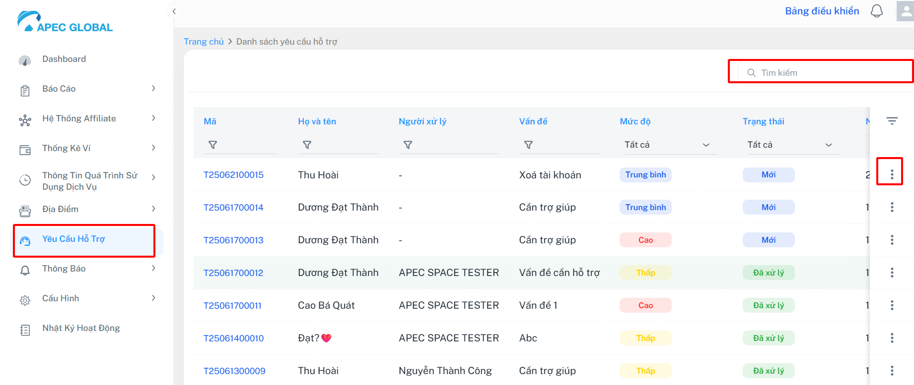 Bao gồm các cột : Mã | Họ tên | Người xử lý | Vấn đề | Mức độ | Trạng thái | Ngày tạo