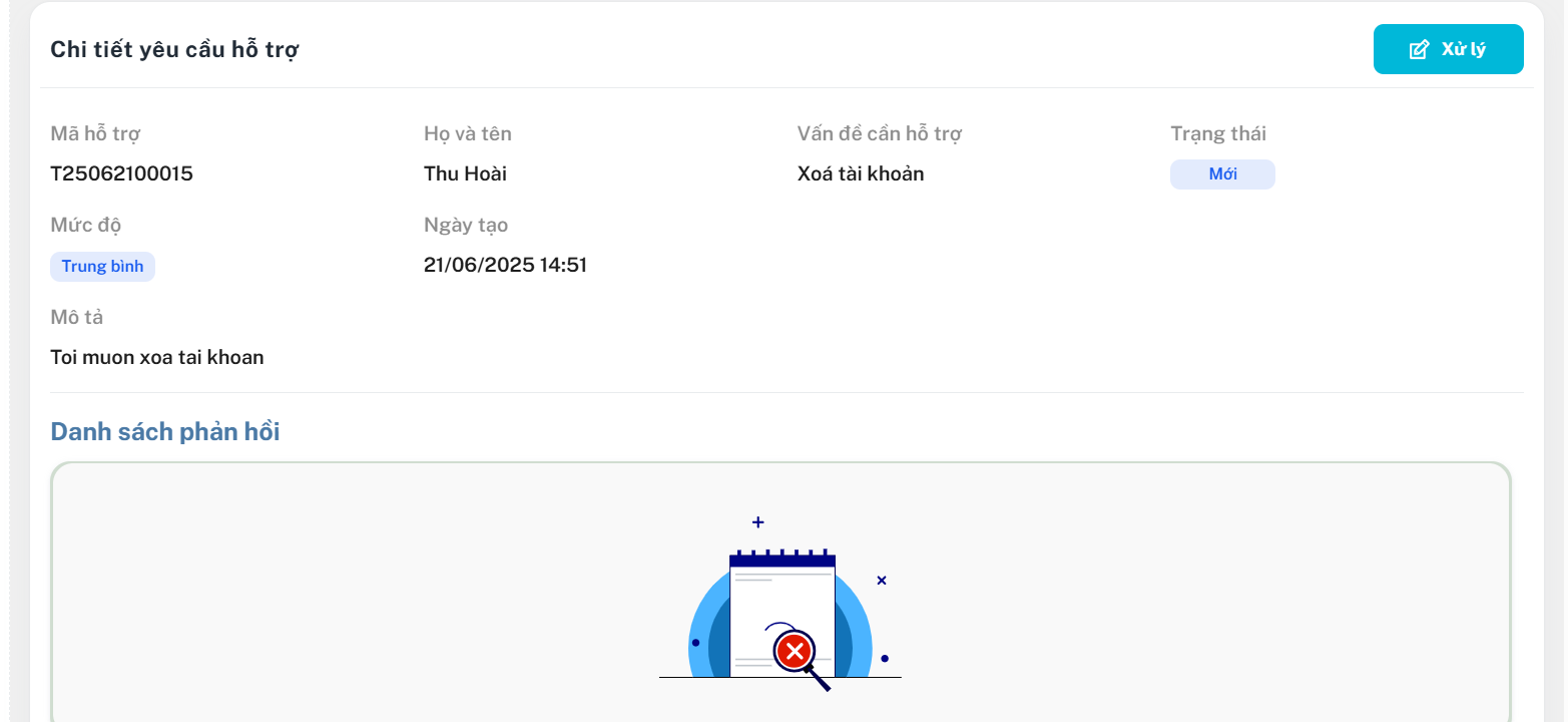 Nhấn vào mã để vào thông tin chi tiết > Nhấn xử lý cho các mục nào yêu cầu còn đang ở trạng thái "Mới" > Điền nội dung xử lý và nhấn Xác nhận