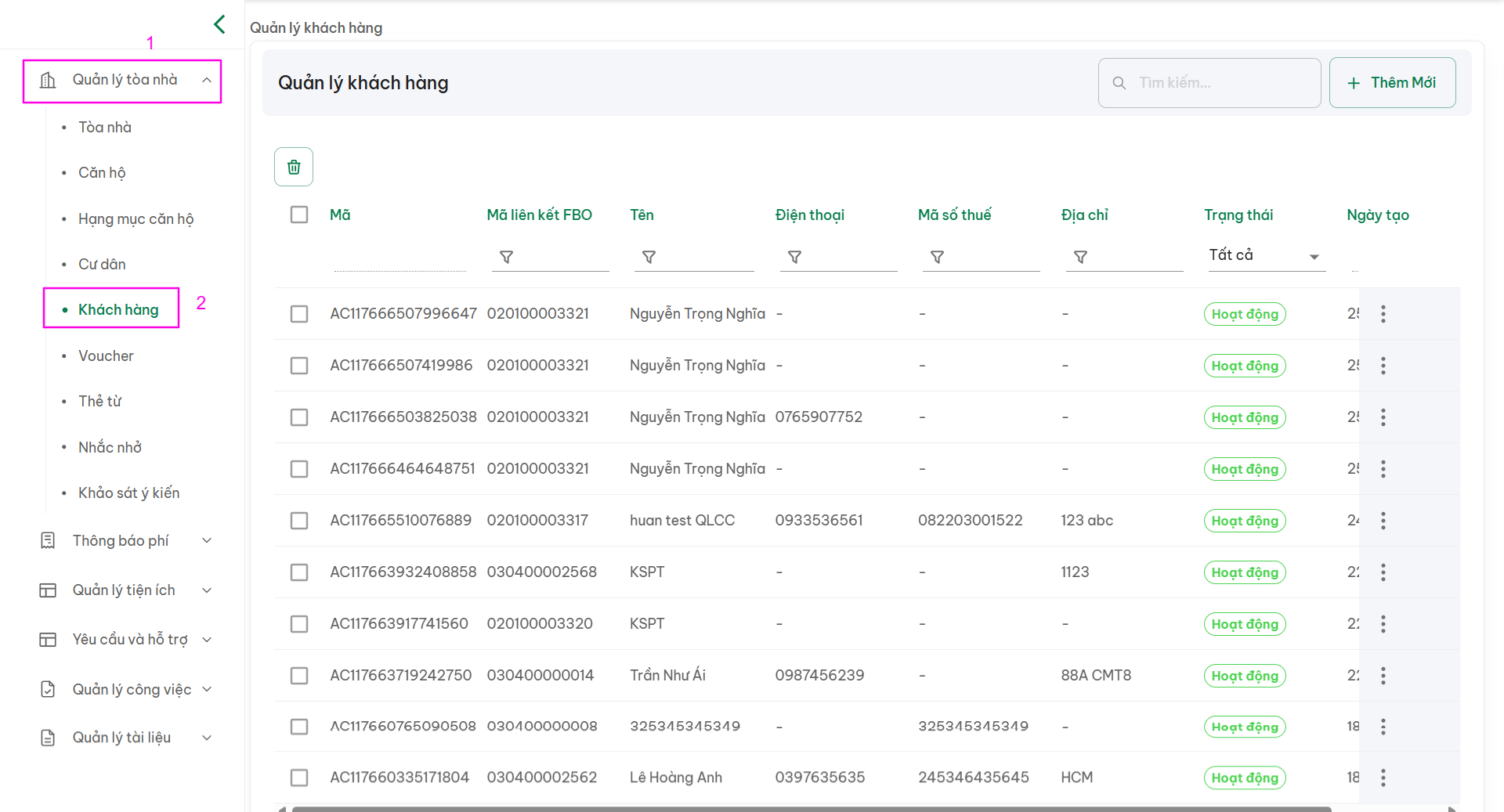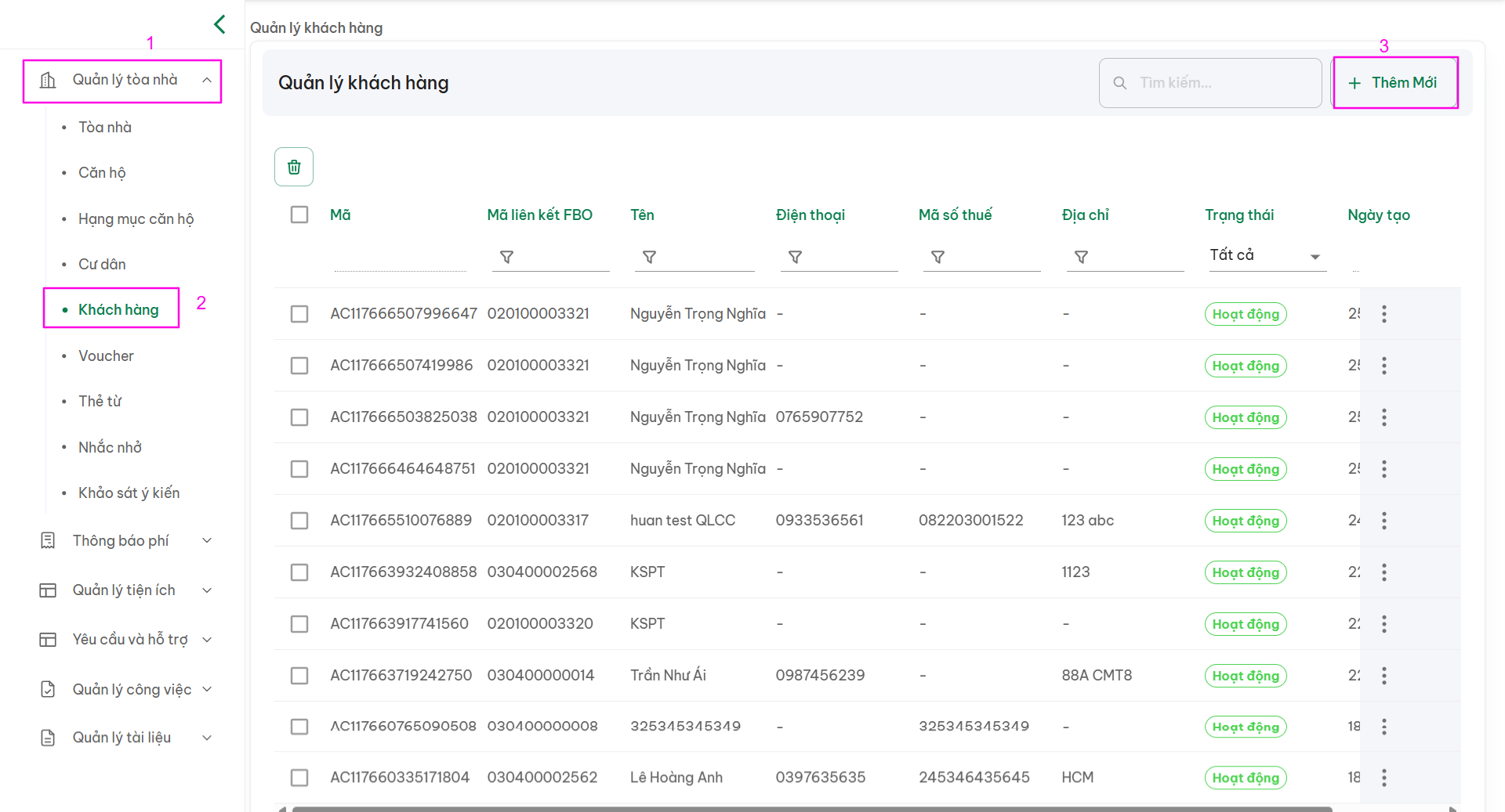Bước 3: Hệ thống hiển thị màn hình quản lý khách hàng