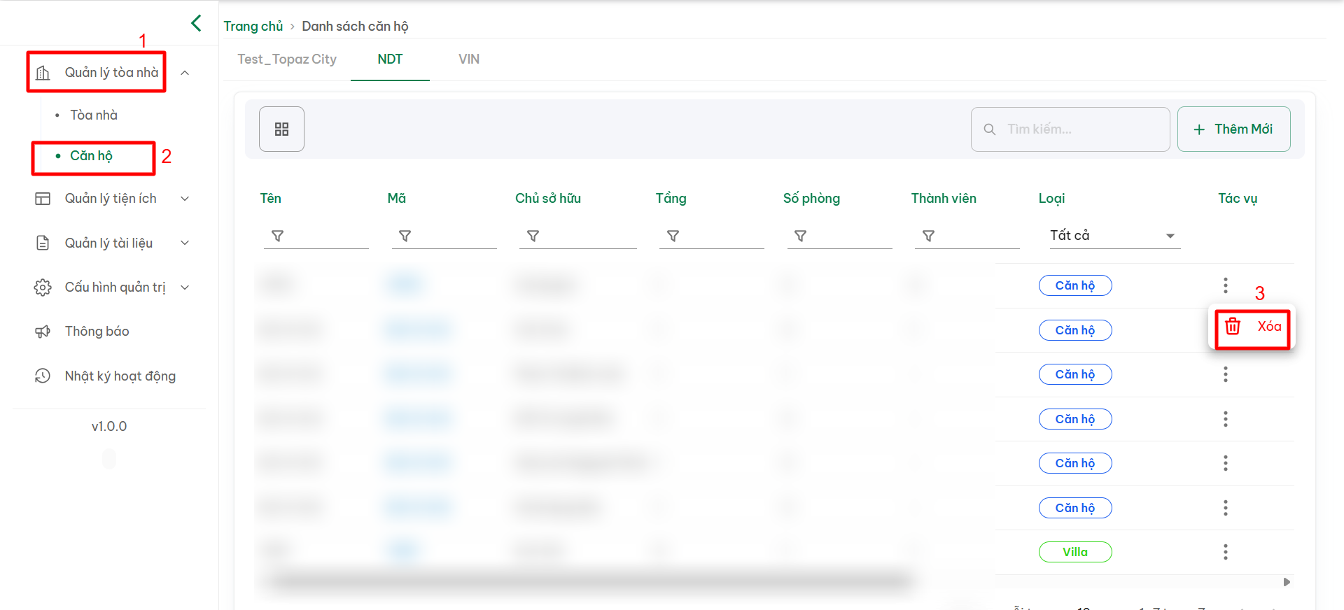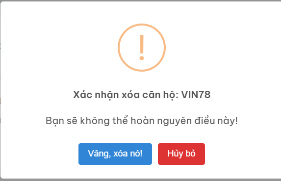 Bước 3: Tại căn hộ cần xóa, nhấn nút “Xóa”.Hệ thống hiển thị cửa sổ xác nhận