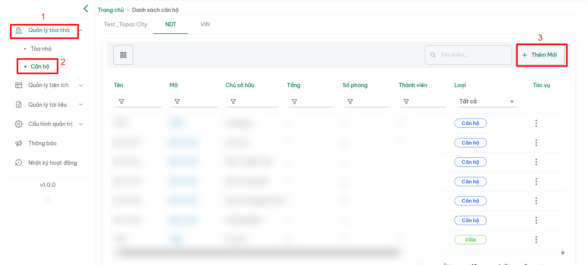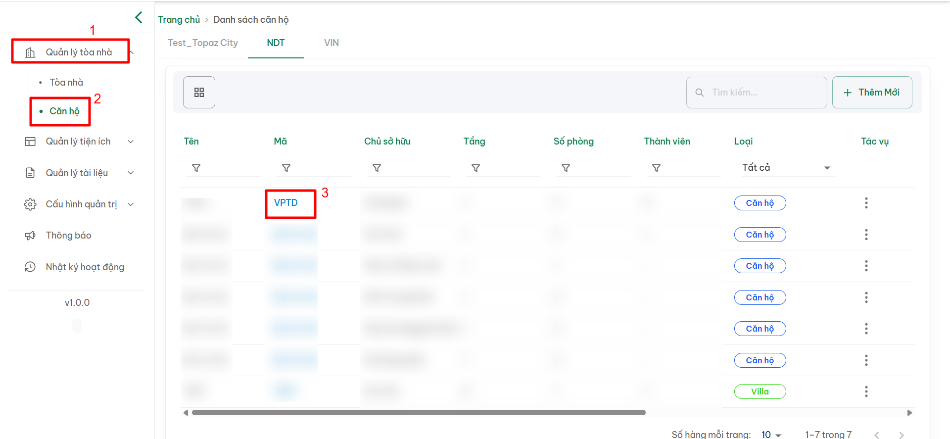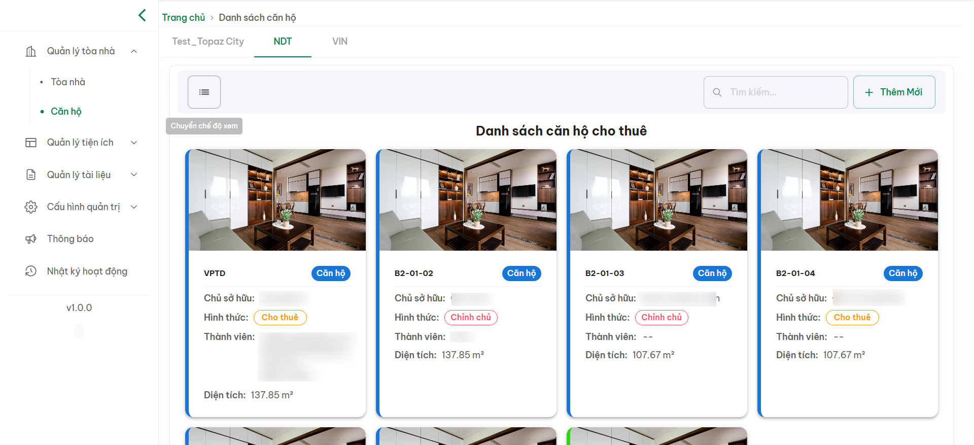 Tên | Mã | Chủ sở hữu | Tầng | Số phòng | Thành viên | Loại | Hình thức | Trạng thái | Ngày nhận nhà | Ngày tạo | Tác vụ