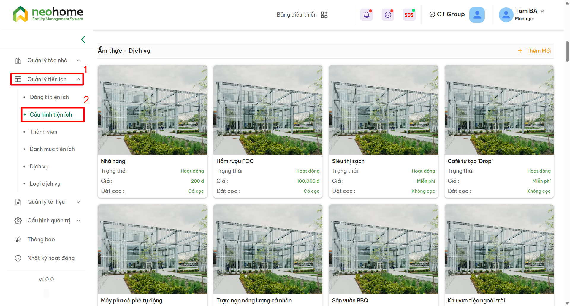 Bước 1: Vào mục "Quản lý tiện ích" trên thanh menu