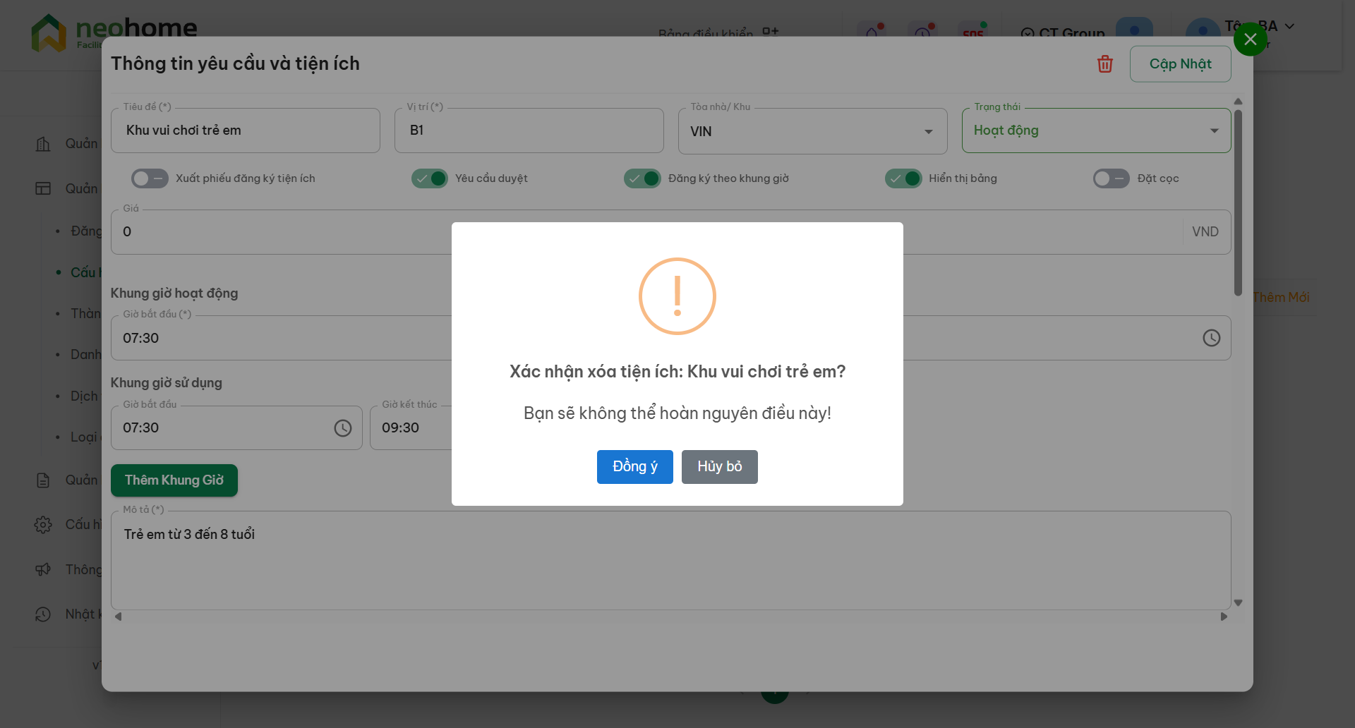 Bước 2: Sau khi nhập đầy đủ thông tin, nhấn “Thêm mới” để hoàn tất quá trình thêm mới.Hệ thống lưu thông tin tiện ích và hiển thị thông báo.