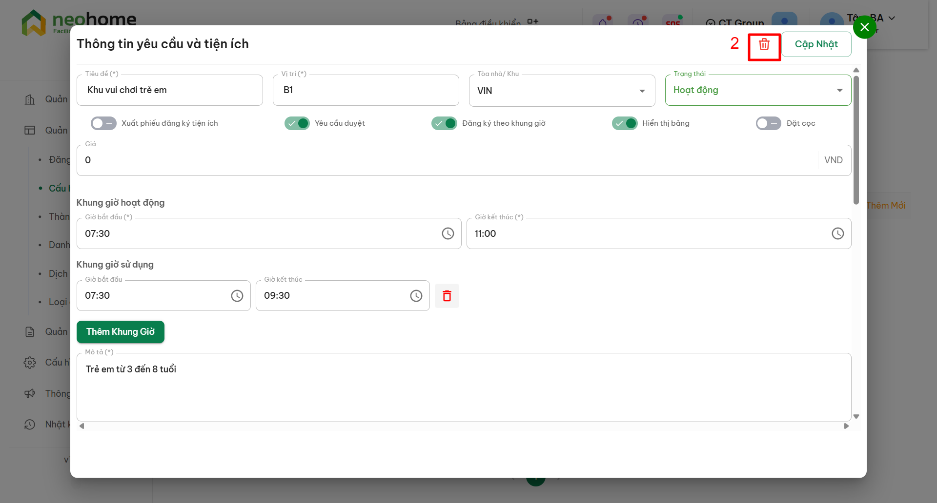 Khung giờ sử dụng: Thời gian mà tiện ích cho phép cư dân đăng ký sử dụng tiện ích