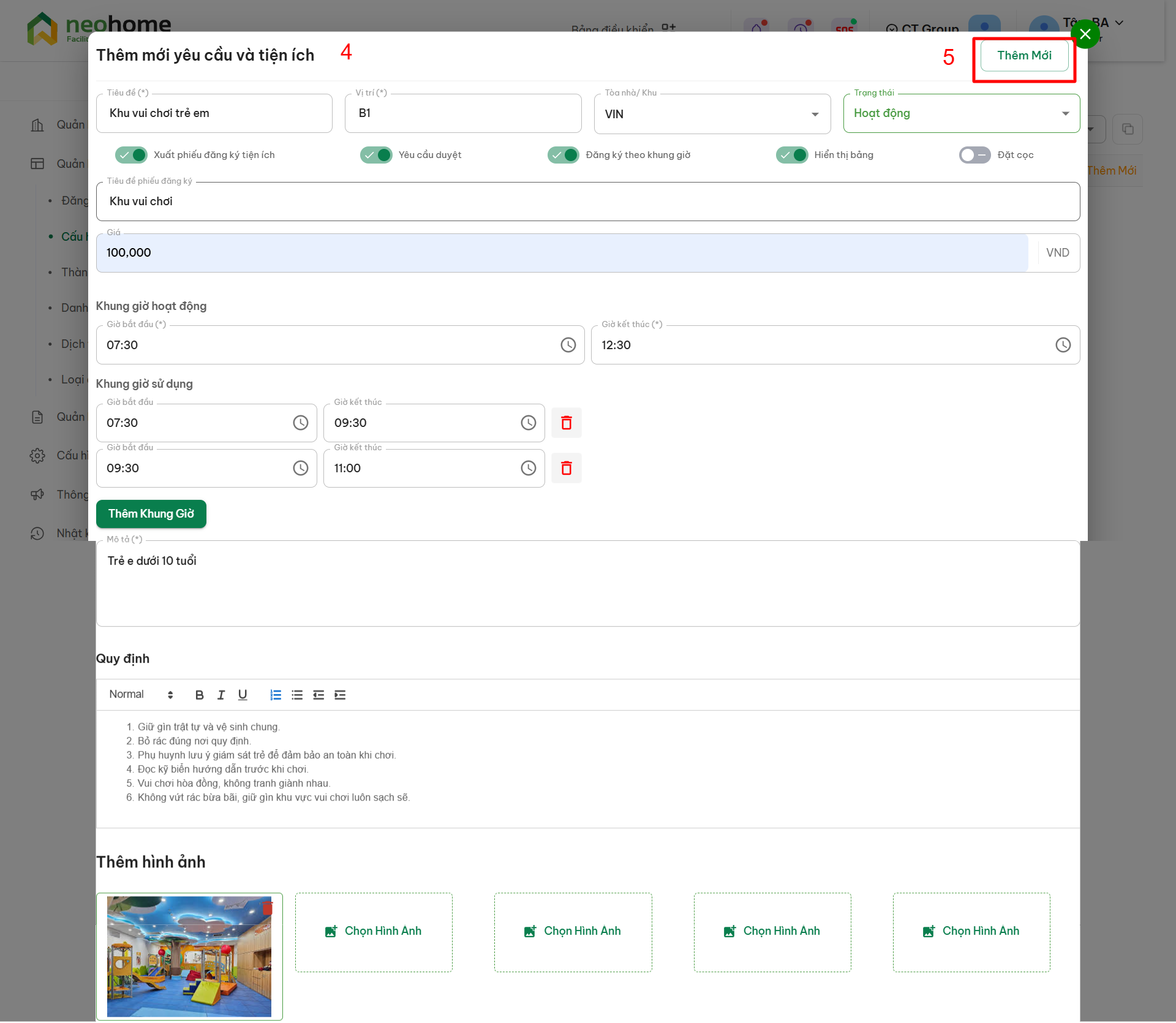 Bước 5: Sau khi nhập đầy đủ thông tin, nhấn “Thêm mới” để hoàn tất quá trình thêm mới.Hệ thống lưu thông tin tiện ích và hiển thị thông báo “Thêm mới thành công".