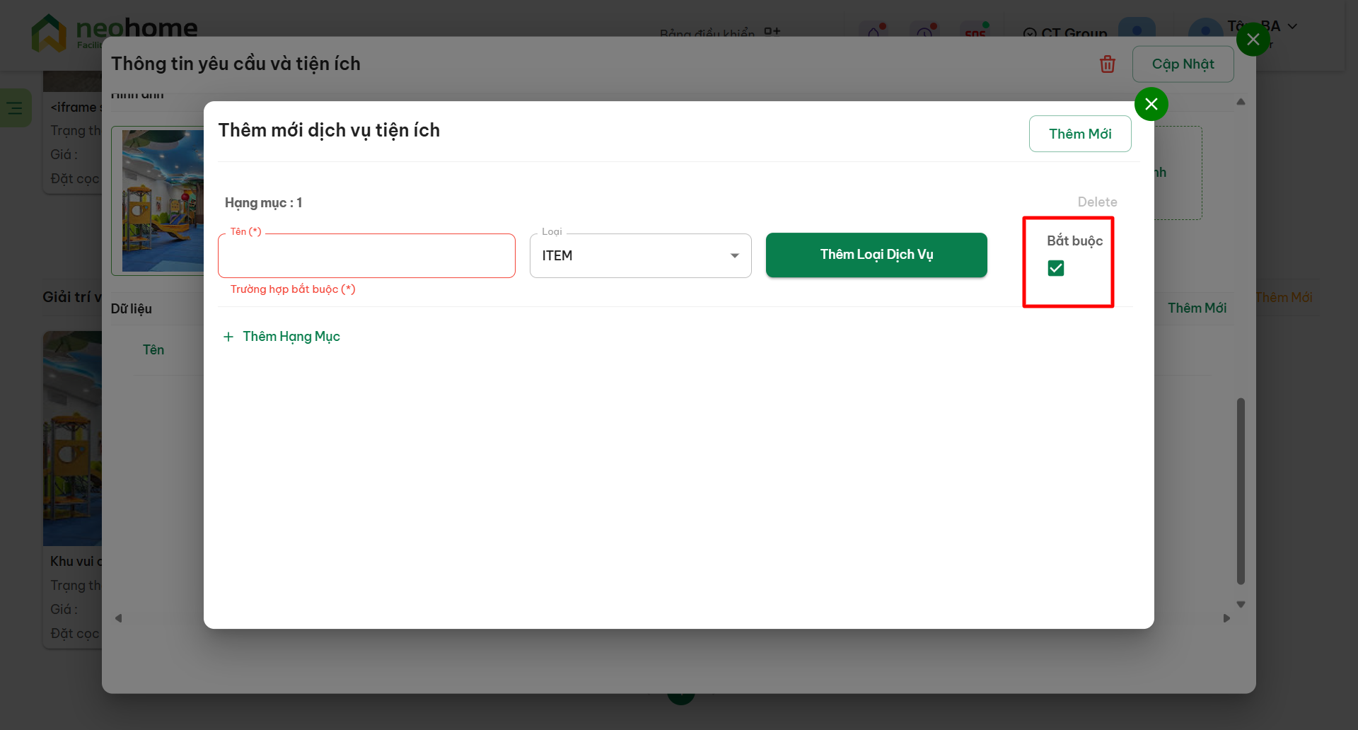 Bước 1: Bấm vào nút "Thêm mới" trong chi tiết "Thông tin yêu cầu và tiện ích". Hệ thống hiển thị cửa sổ thêm mới, điền các thông tin chính xác theo yêu cầu