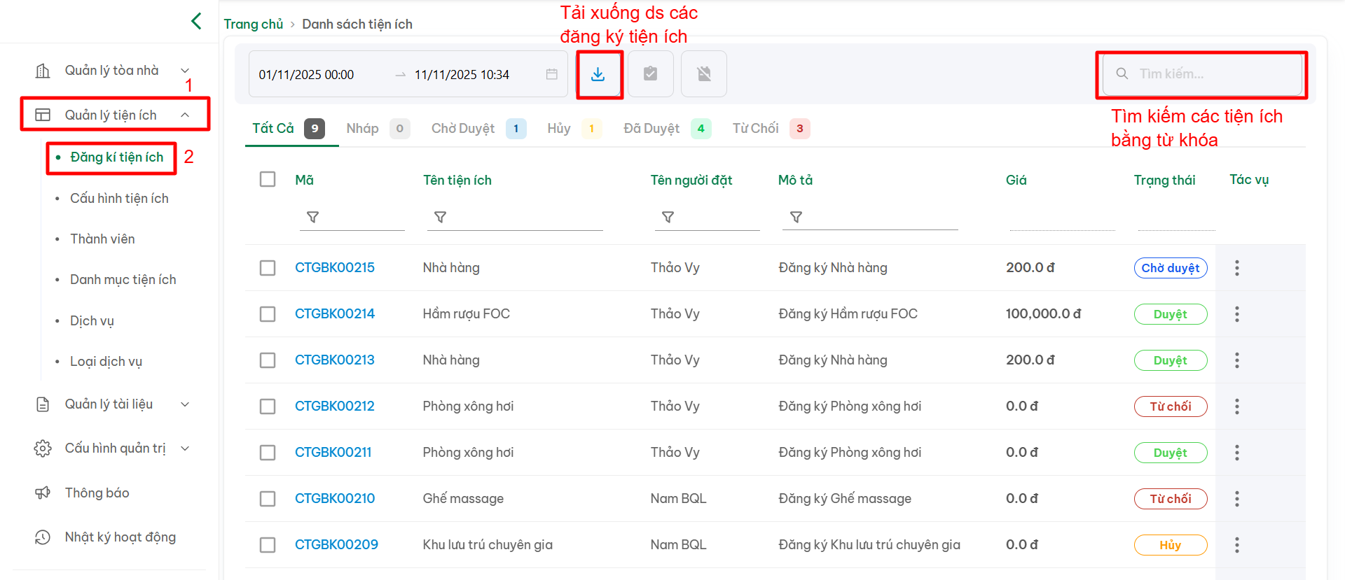 - Đã duyệt: Yêu cầu đăng ký đã được Ban quản lý phê duyệt, người dùng có thể sử dụng tiện ích theo thời gian đăng ký.
