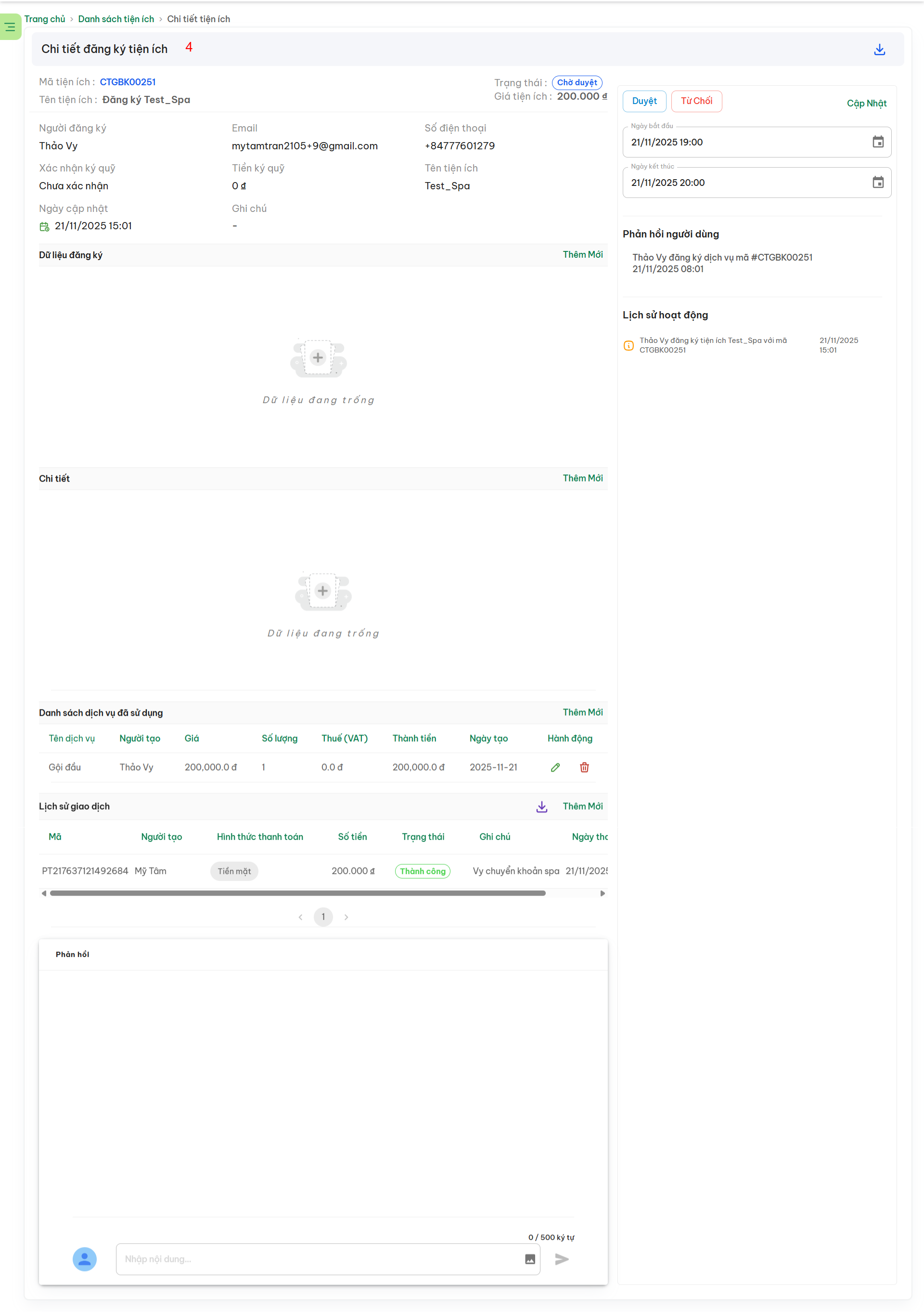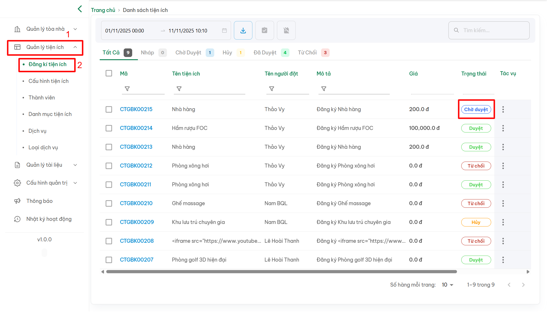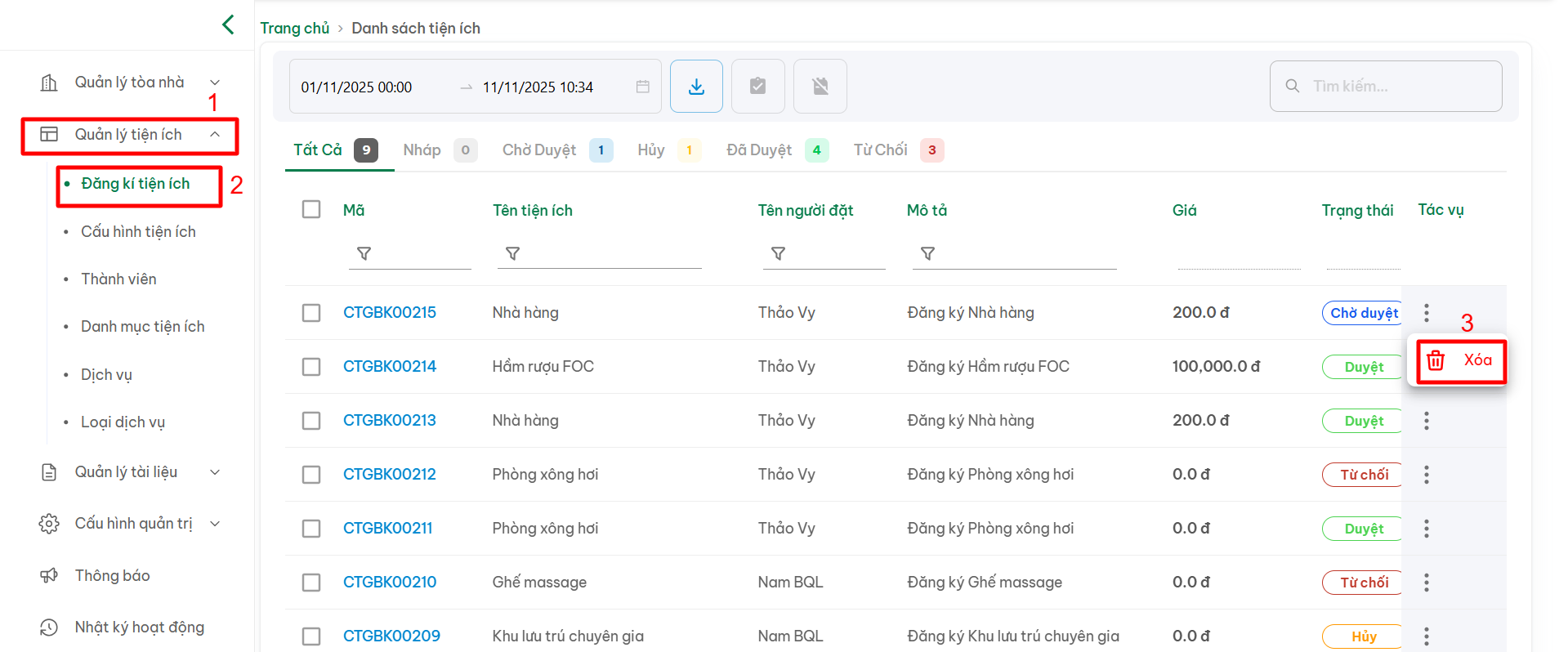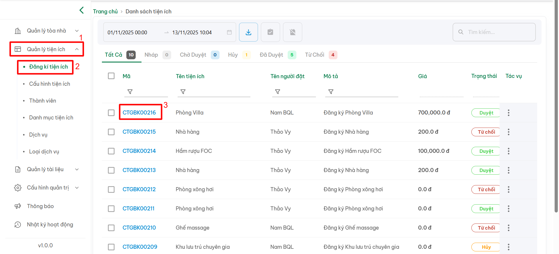 2. Duyệt/ từ chối phiếu đăng ký tiện ích của người dùng