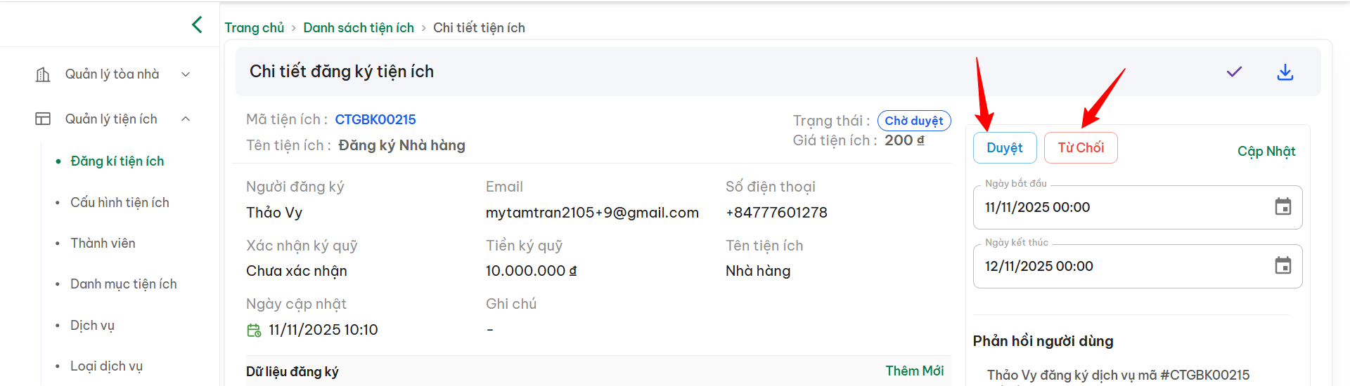 Bước 4: Trong "Chi tiết đăng ký" chọn "Duyệt" hoặc "Từ chối" đăng ký tiện ích