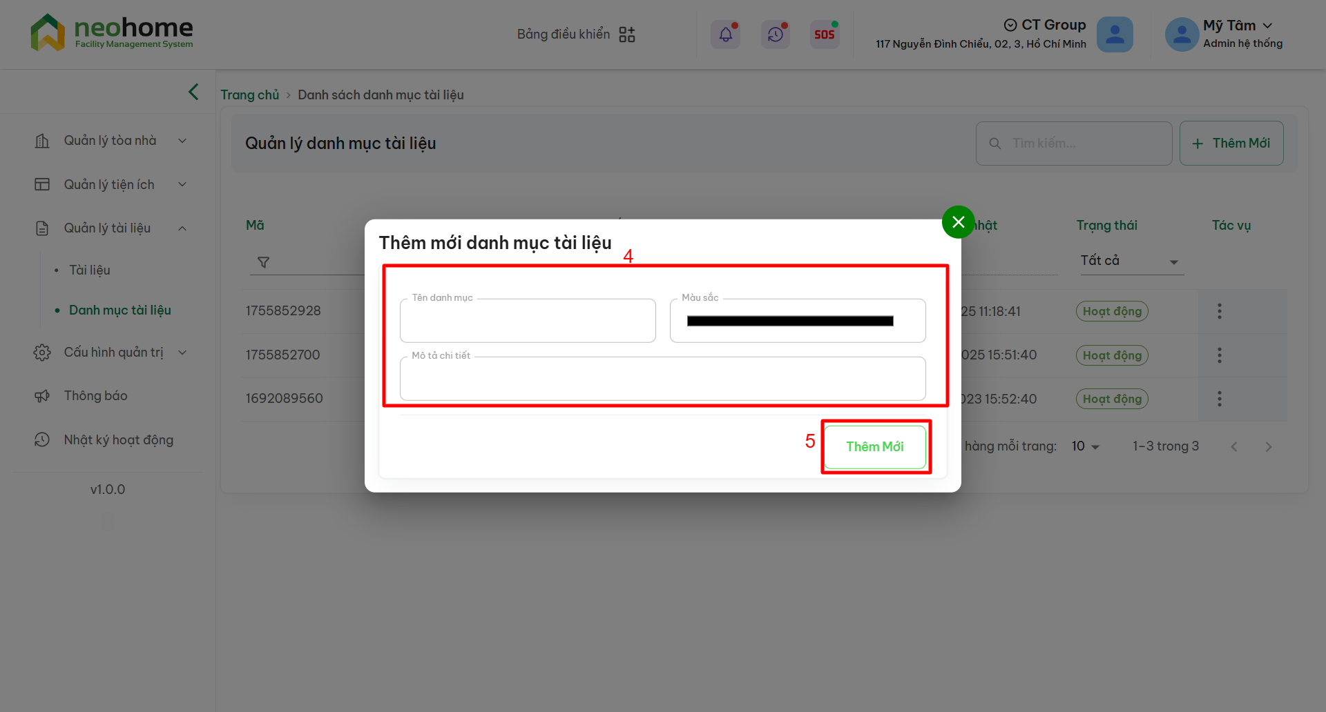 Bước 5: Sau khi nhập đầy đủ thông tin, nhấn “Thêm mới” để hoàn tất quá trình thêm mới. Hệ thống hiển thị thông báo “Thêm mới danh mục tài liệu thành công”.
