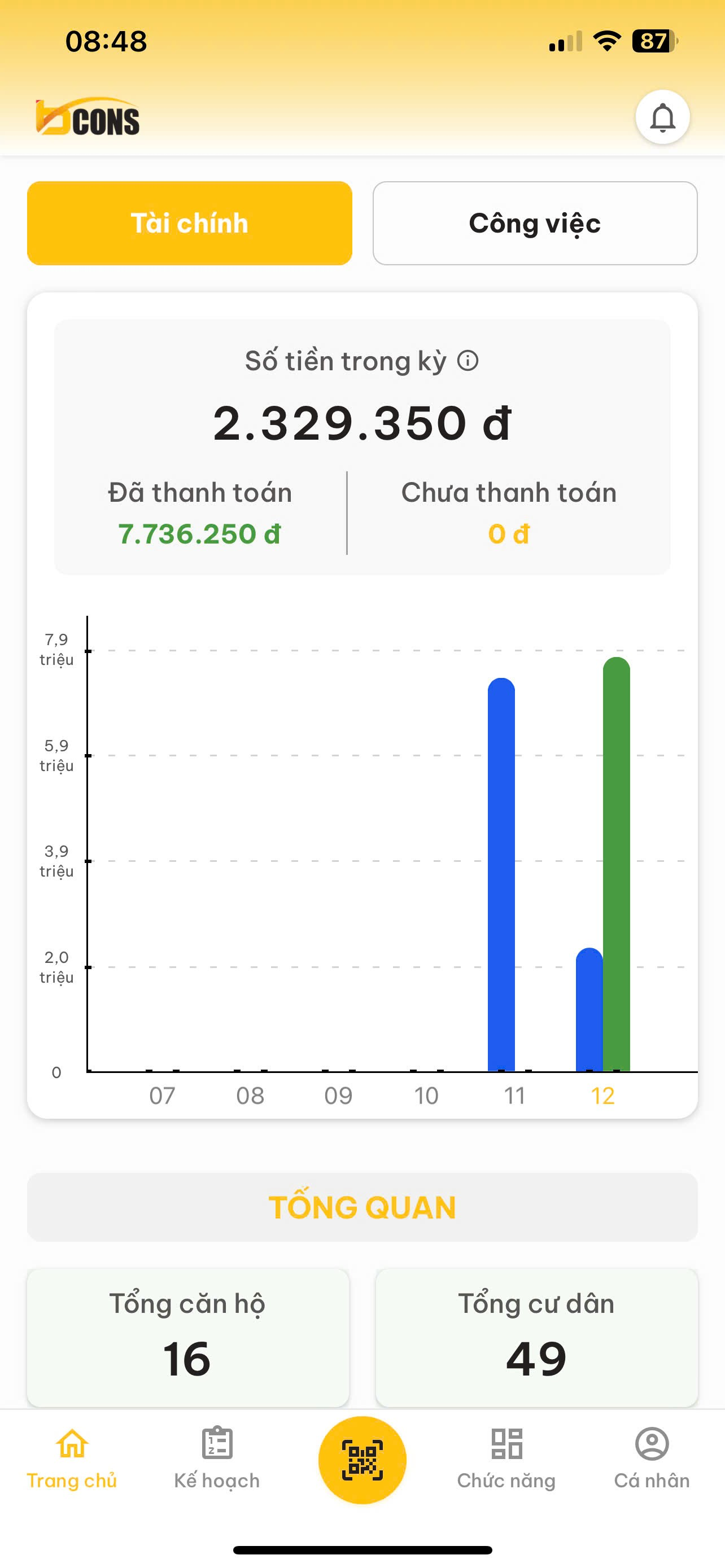 Tài chính : Hiển thị báo cáo tổng doanh thu, tổng số căn hộ, tổng cư dân