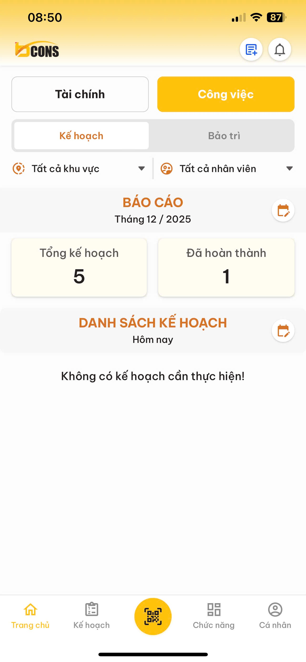 Màn hình "Kế hoạch": Xem báo cáo tổng số kế hoạch, Kế hoạch đã hoàn thành, Danh sách các kế hoạch cần thực hiện hôm nay. |