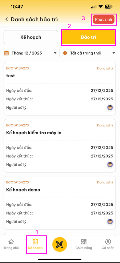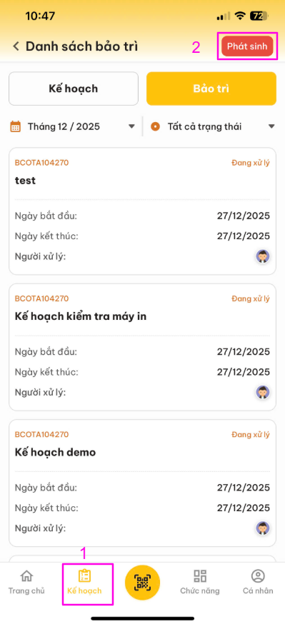 Sau khi đăng nhập thành công . Nhân viên vào "Kế hoạch"-> Chọn "Bảo trì" -> Chọn "Phát sinh" -> Hiển thị danh sách các phát sinh