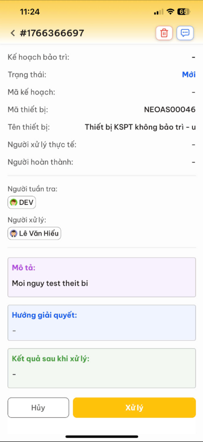 Truy cập vào chi tiết phiếu sự cố (ví dụ: phiếu #1766366697) để xem thông tin:
