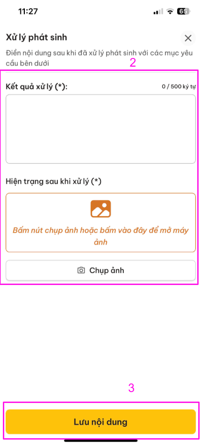 Mô tả phát sinh (*): Nhập nội dung chi tiết về sự cố bạn đang cảnh báo (Ví dụ: Máy kêu to, rò rỉ nước...). Tối đa 500 ký tự.