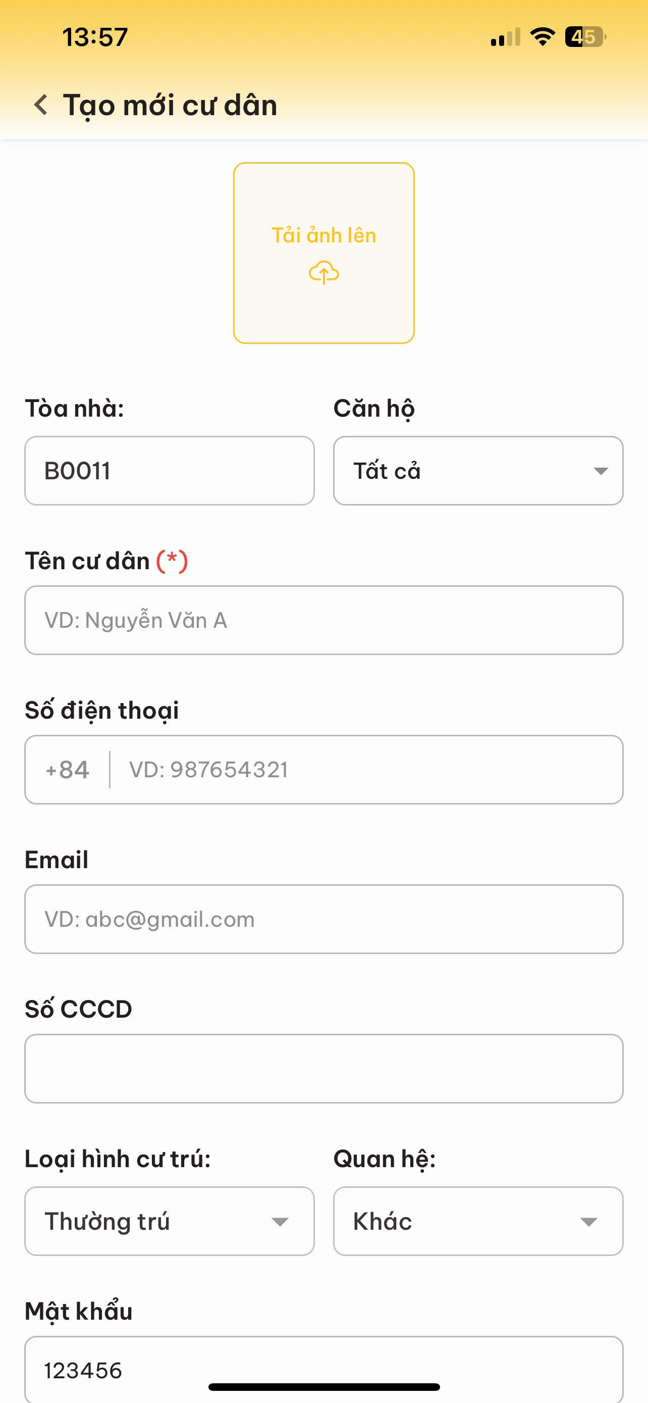 - Số điện thoại : Số điện thoại để liên lạc với cư dân