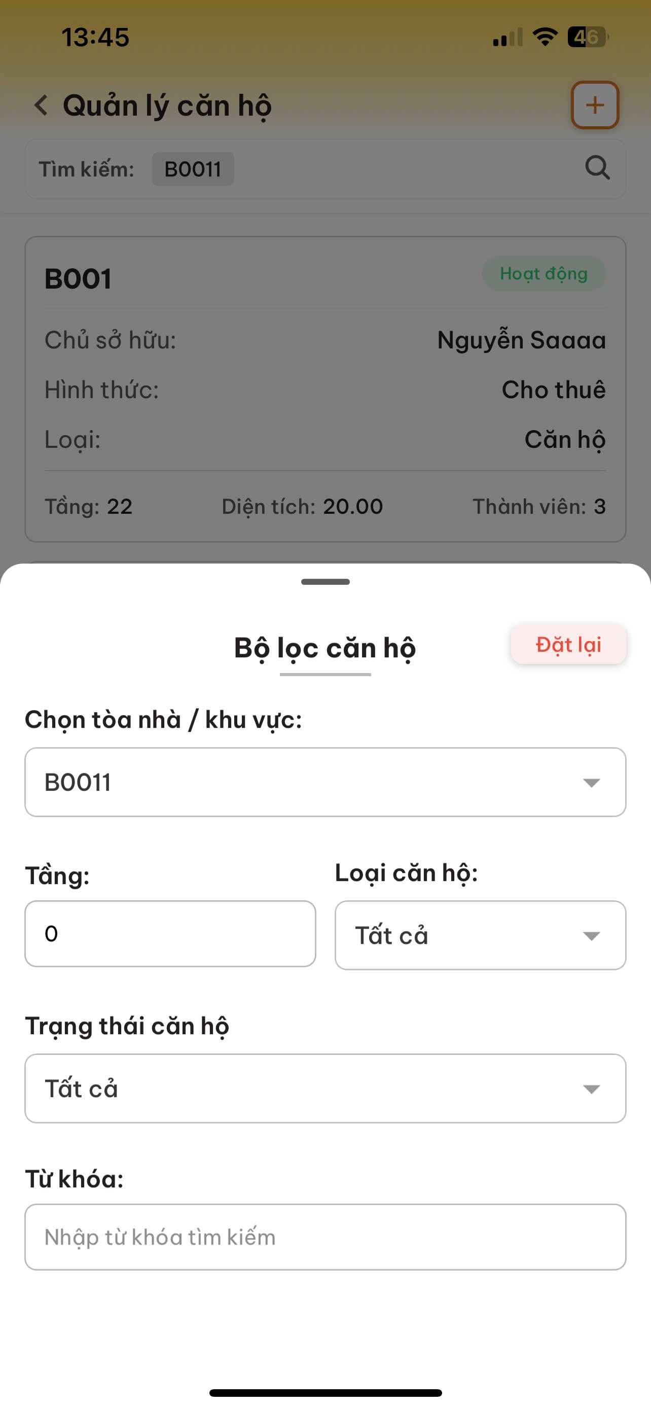 - Từ khóa Nhập từ khóa để tìm kiếm thông tin cư dân một cách nhanh chóng