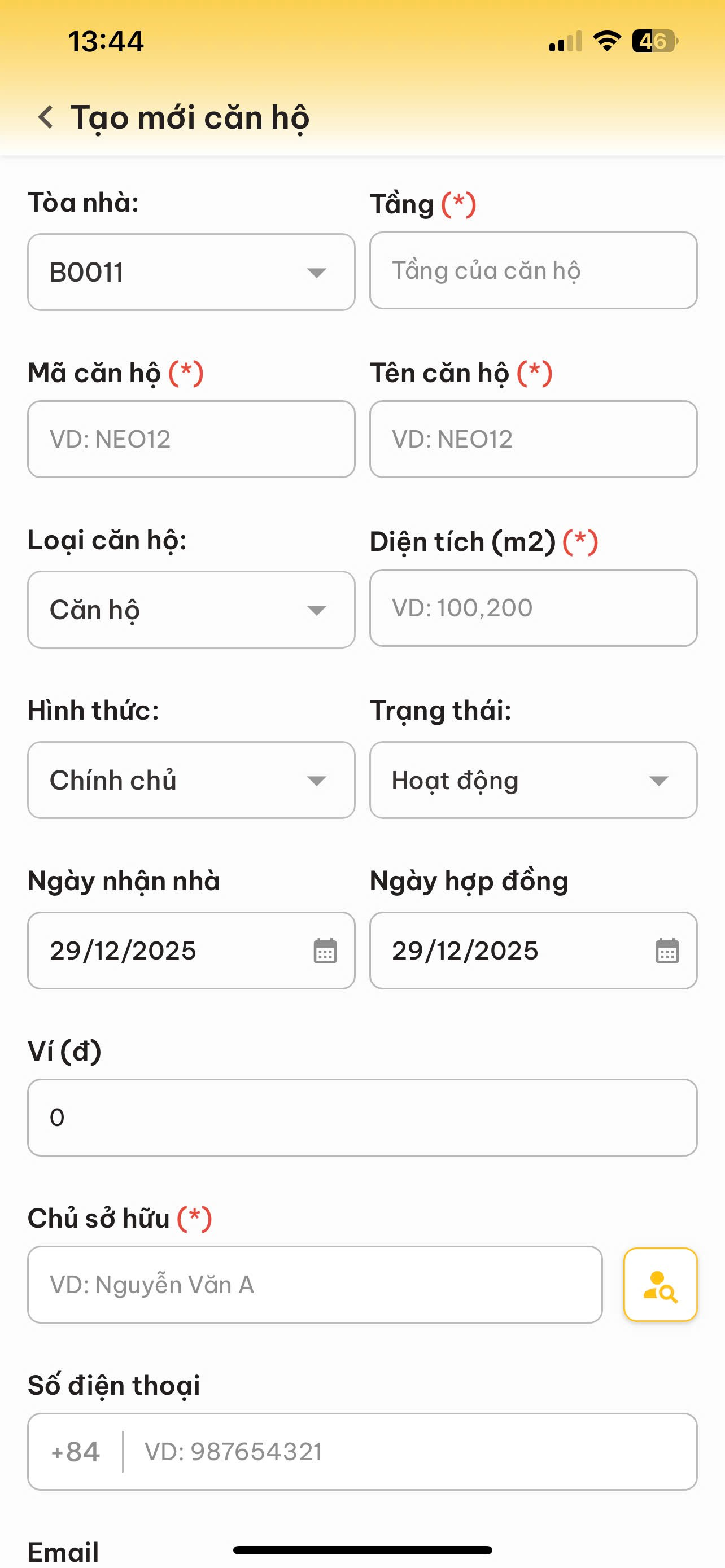 Định danh: Nhập Mã căn hộ () và Tên căn hộ () (Thường giống nhau, ví dụ: NEO12).