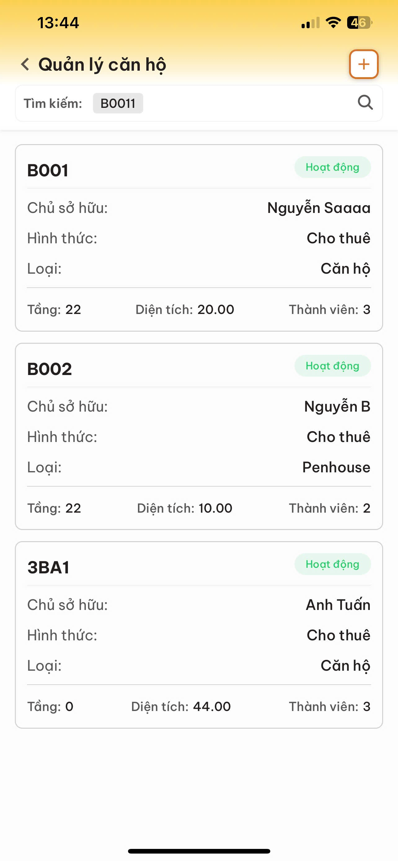 Trạng thái: (Màu xanh) Hiển thị "Hoạt động" nếu căn hộ đang được sử dụng bình thường.